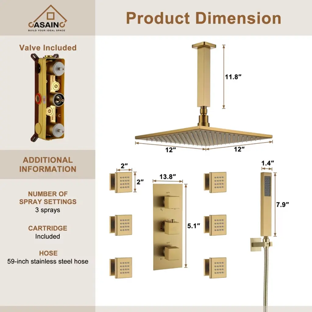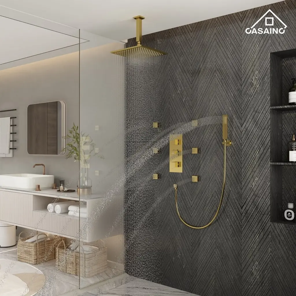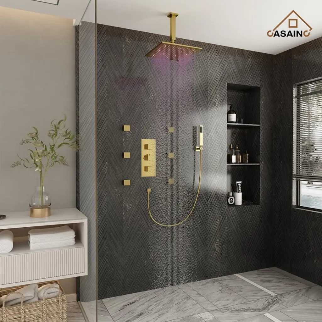 Casainc 6-spray 12 In. Led Thermostatic Dual Shower Heads Ceiling Mount Fixed And Handheld Shower Head 2.5 Gpm In Brushed Gold