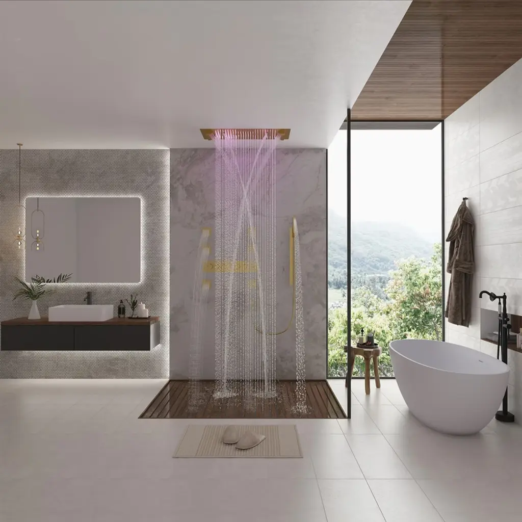 Indulge in our cutting-edge 6-in-1 shower system. With a top spray boasting 64-color LED lights and music playback, plus options like handheld, Rainshower, waterfall, mist, and massage, each shower becomes a personalized spa retreat. Elevate your bathing experience and rejuvenate your body and mind.