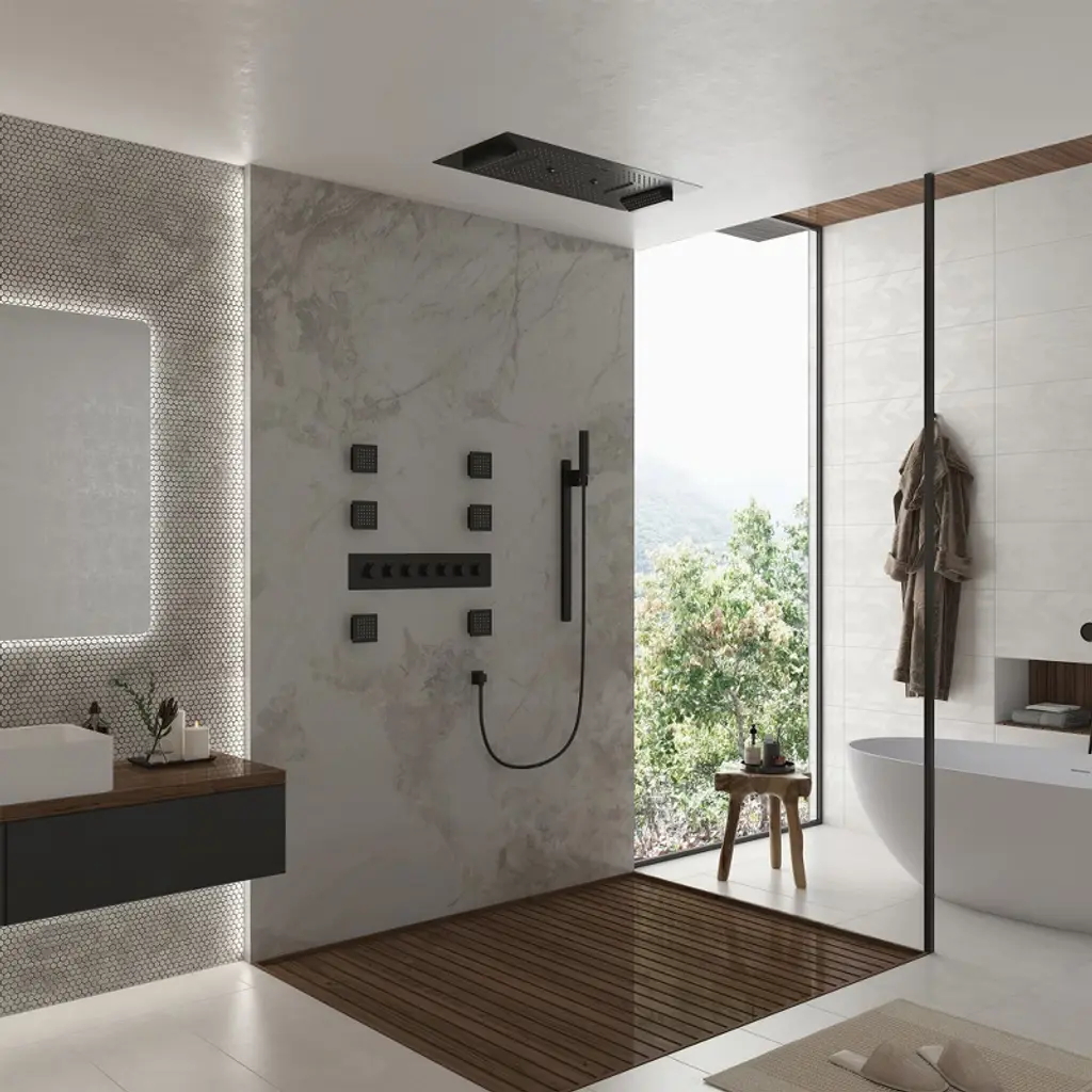 Indulge in our cutting-edge 6-in-1 shower system. With a top spray boasting 64-color LED lights and music playback, plus options like handheld, Rainshower, waterfall, mist, and massage, each shower becomes a personalized spa retreat. Elevate your bathing experience and rejuvenate your body and mind.