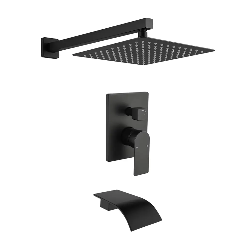 This bathroom shower set has a 10-inch stainless steel square rain shower head,air-in Technology.The single handle allows for easy adjustment of water flow and water temperature. US standard 1/2 NPT thread.