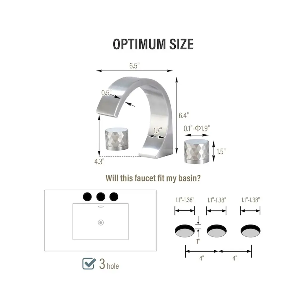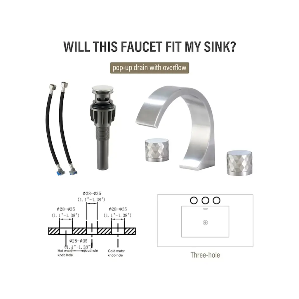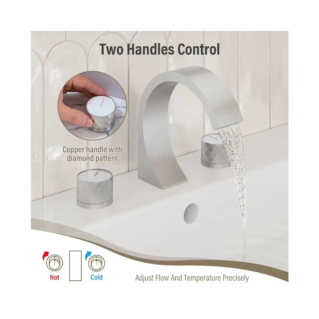 The waterfall spout will add a classic look to any existing bathroom style. A clear and steady laminar stream provides beautiful water presentation. The solid brass material is durable and long-lasting. Easy to install, this faucet is suitable for a 3-hole widespread installation configuration (6-12 inches) (about 15.2-30.5 cm).
