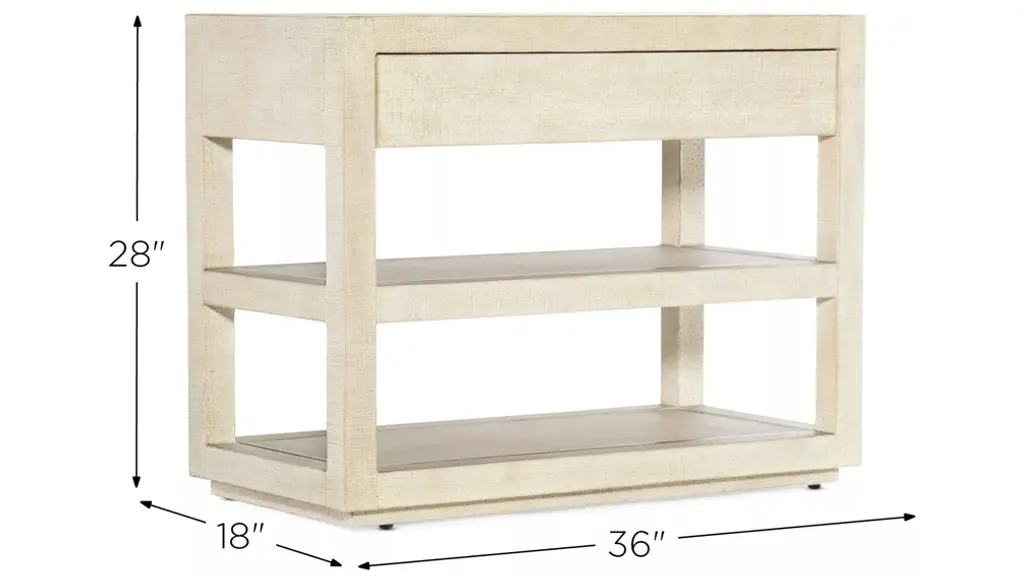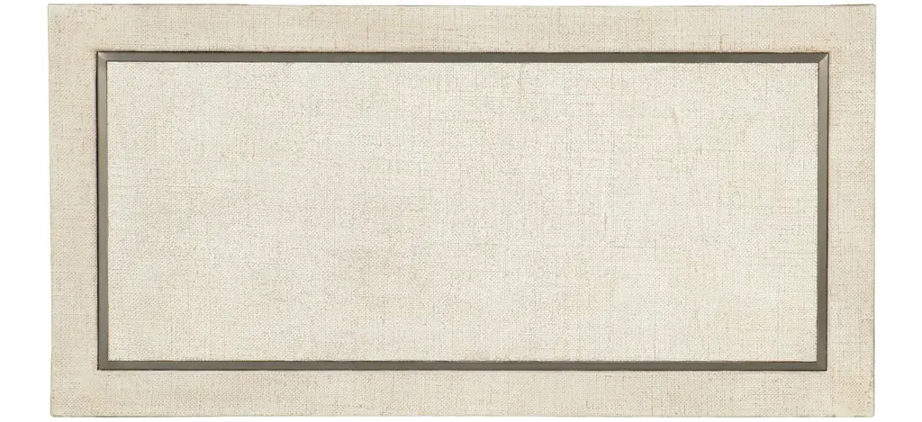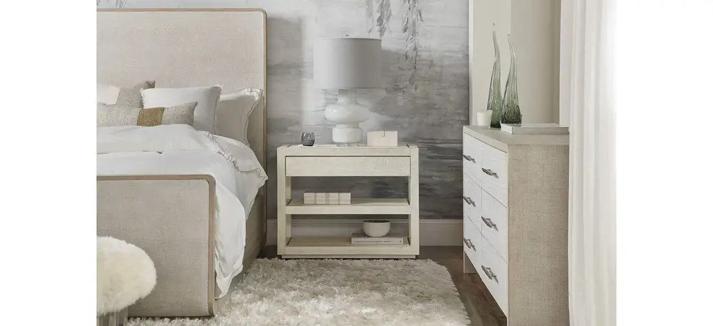 A sleek profile combines with a serene color palette in the Cascade Nightstand, offered in a lacquered burlap finish called Pebble Beach with a champagne-colored metal inlay around the top for a touch of sparkle. This airy piece offers the function of a middle and bottom shelf, one self-closing drawer and a cord clip on the back. Finished on all sides.