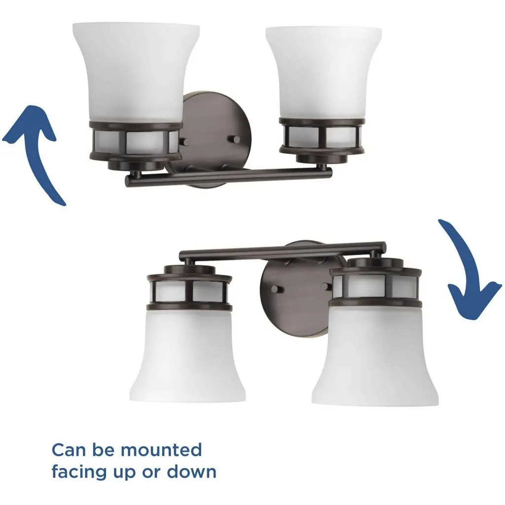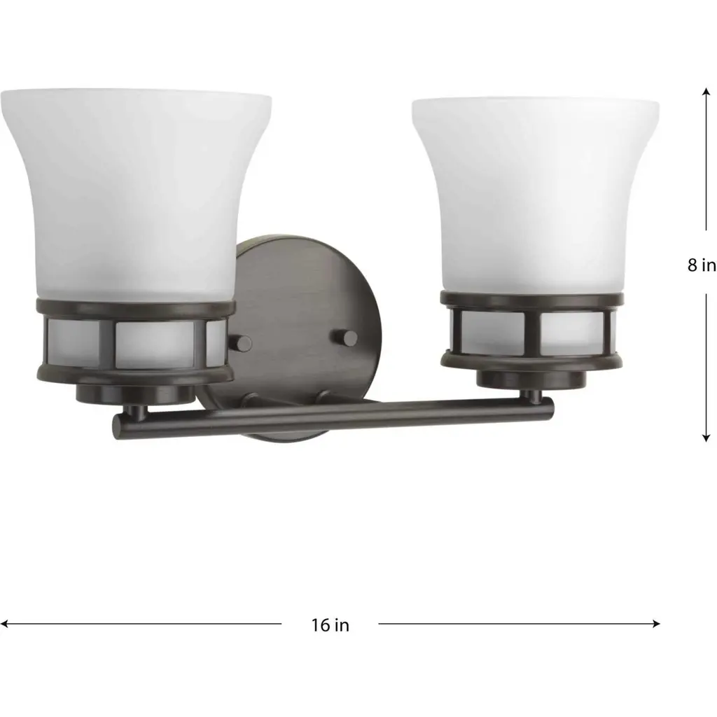 Two-light bath & vanity with smooth forms and windowpane style gallery that produce a beautiful, modern gas light effect. Overscaled tubing and etched glass shades offer substance within the sleek frame. Can be mounted up or down. Antique Bronze finish.
