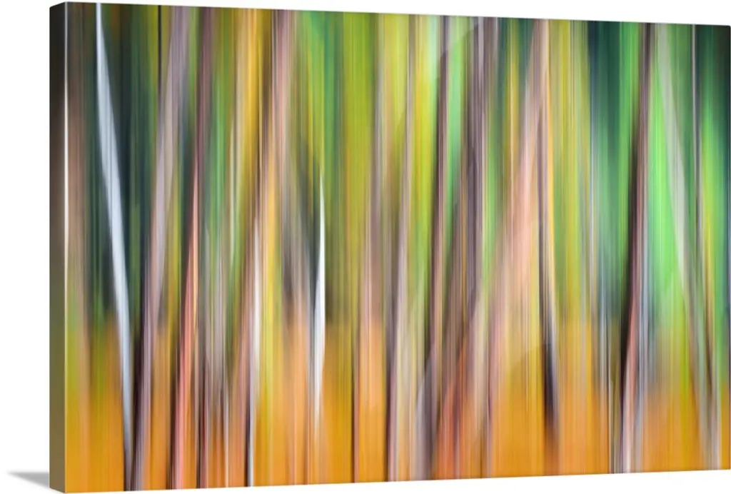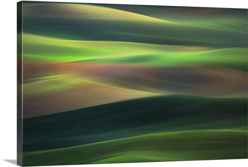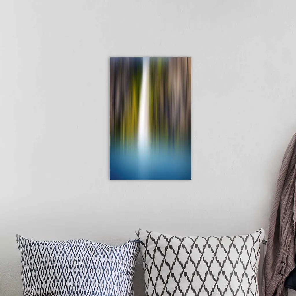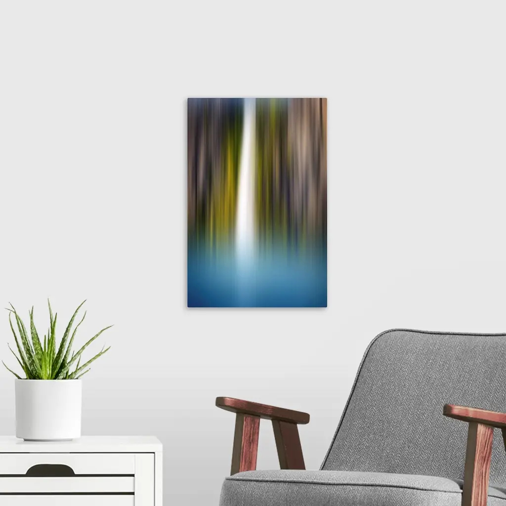Abstract photograph of a blurred waterfall with brown, green, blue, and white hues.