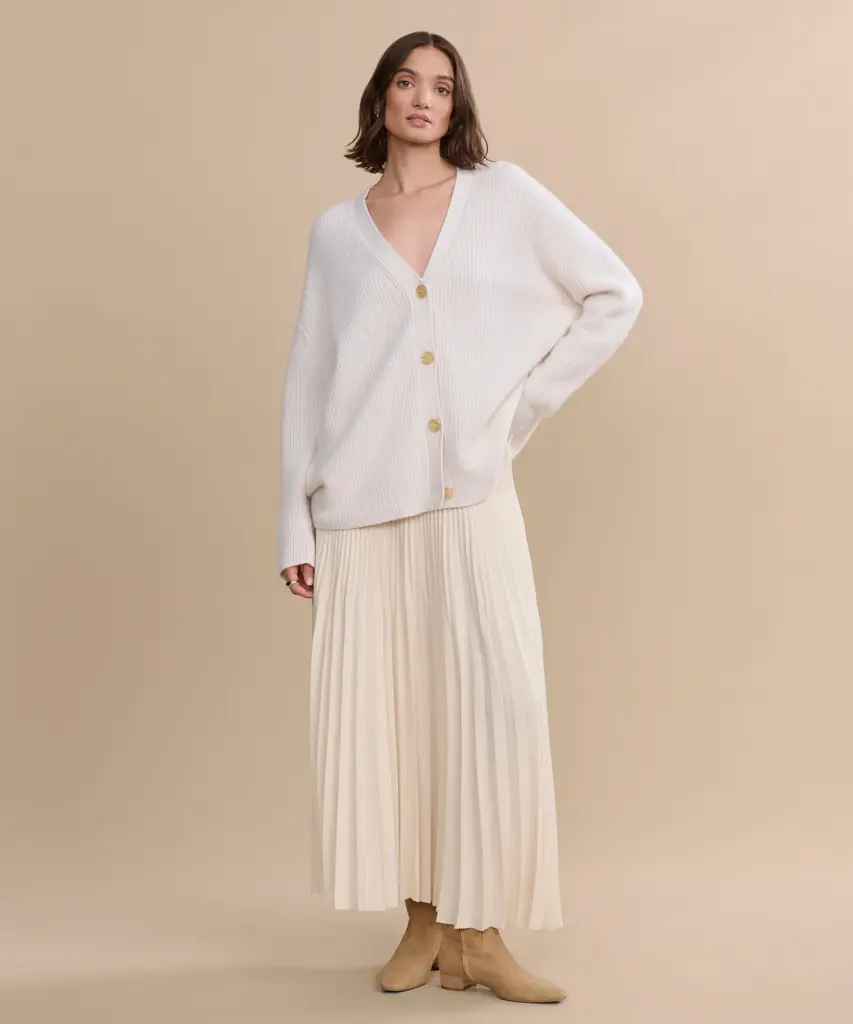 Cashmere Cocoon Cardigan Ivory Our favorite slouchy cardigan in luxuriously soft, lightweight, pure cashmere. A dramatically oversized body and the perfect relaxed fit make it the dream all-purpose cardigan. Go casual by wearing it unbuttoned with jeans and a t-shirt, or buttoned with trousers and a bralette for a more dressed-up variation. Please note that this item is not eligible for promotions.