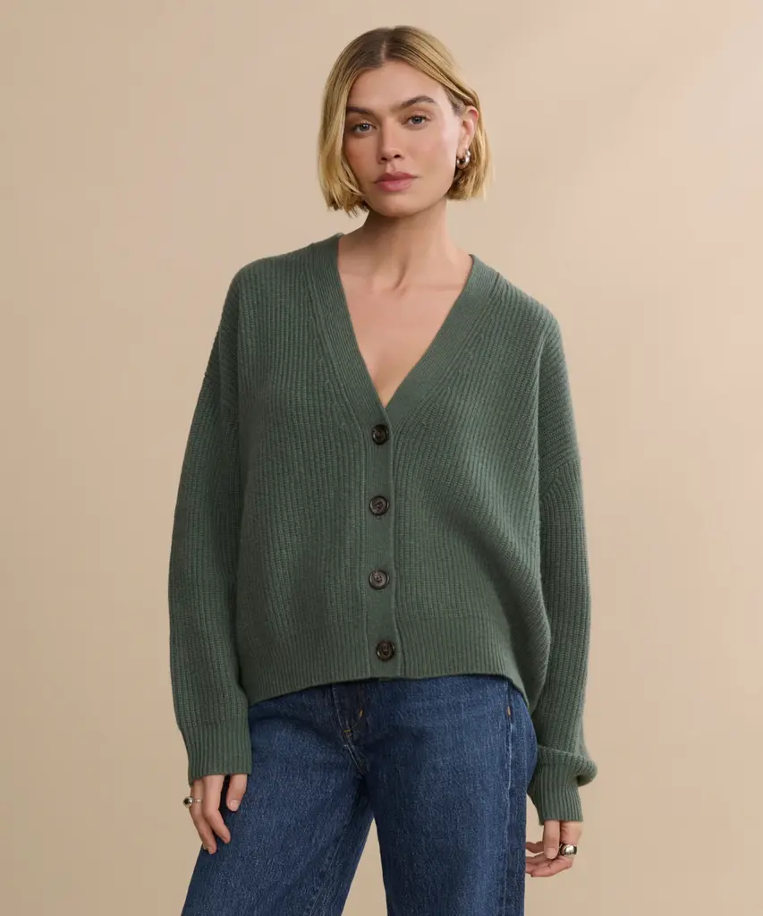 Cashmere Cocoon Cardigan Olive Our favorite slouchy cardigan in luxuriously soft, lightweight, pure cashmere. A dramatically oversized body and the perfect relaxed fit make it the dream all-purpose cardigan. Go casual by wearing it unbuttoned with jeans and a t-shirt, or buttoned with trousers and a bralette for a more dressed-up variation.