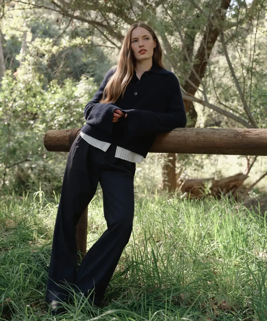 Cashmere Stevie Polo Navy The cashmere felt knit boasts the softness of cashmere with a touch of stretch—and the fit is both classic and fresh, with an oversized point collar, a partial button placket, wide sleeves, and rib trim. And the styling possibilities? Endless—though we recommend pairing it with the Demi Pant.