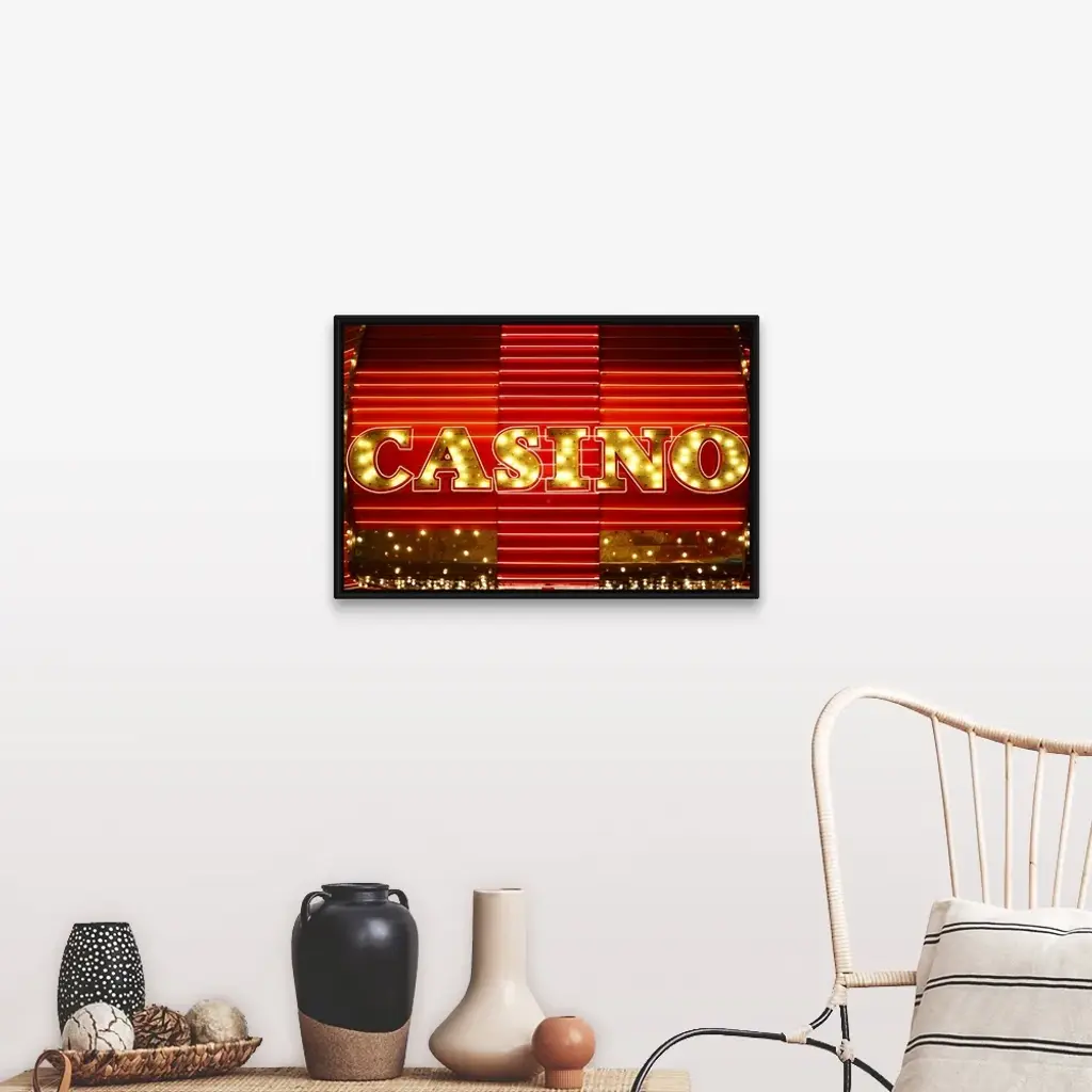 Floating Frame Canvas Wall Art with Black Frame entitled 'Casino lights, Las Vegas, Nevada'. Multiple sizes available. Primary colors within this image include: Dark Red, White, Brown. Made in the USA. Satisfaction guaranteed. Inks used are latex-based and designed to last.