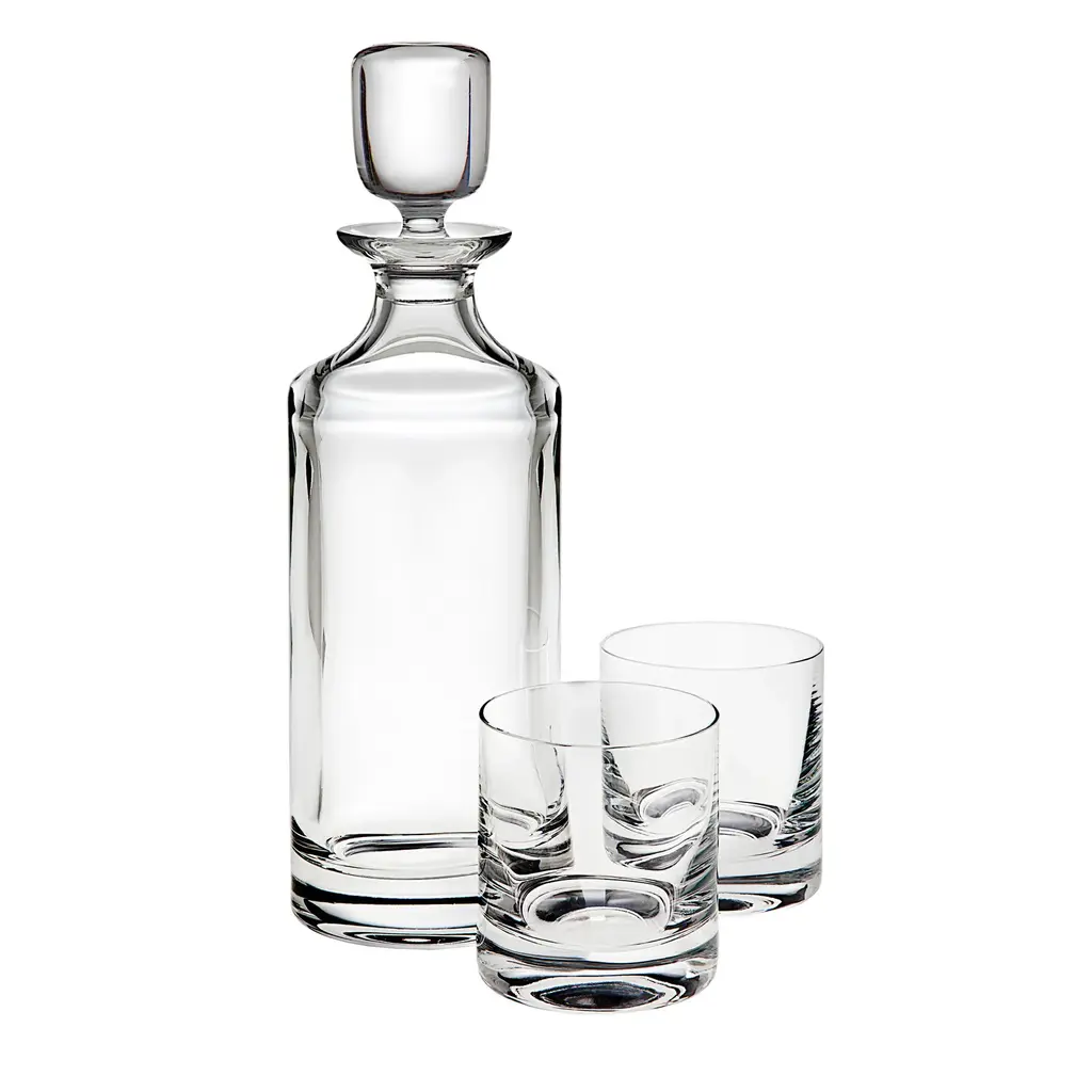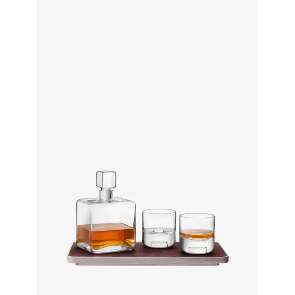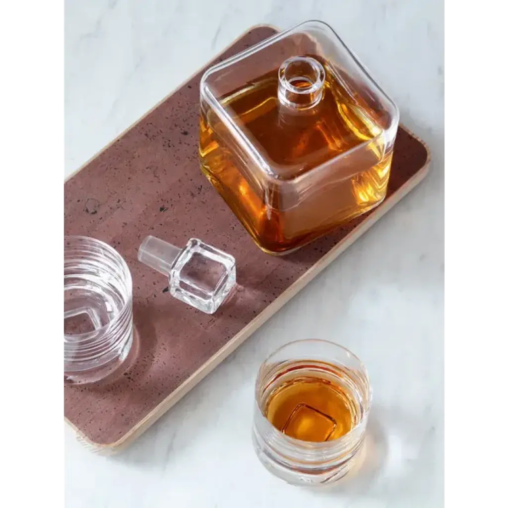 Contemporary mouth-blown whisky tumblers and a square-shaped decanter, set on an ash wood tray with cork veneer.