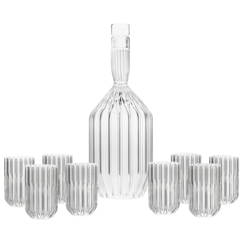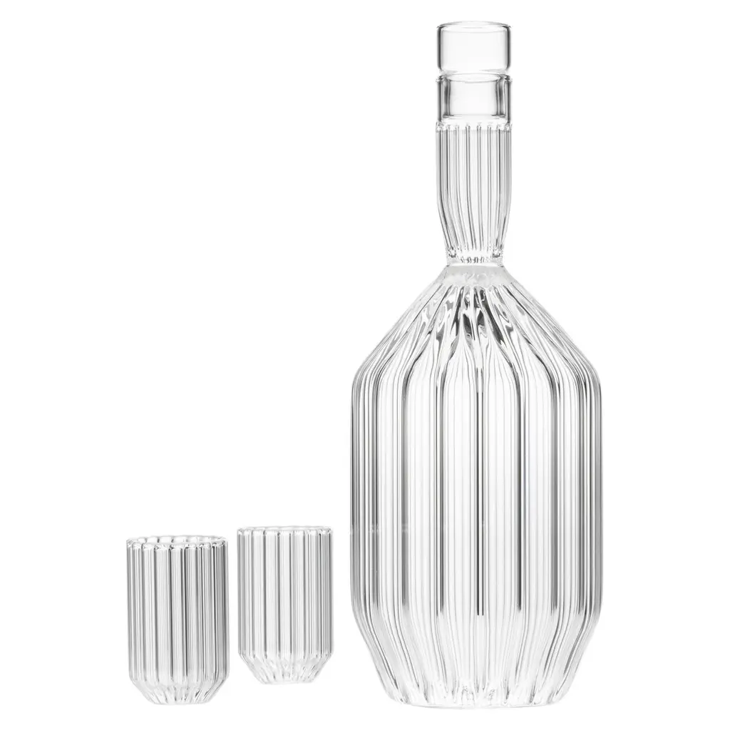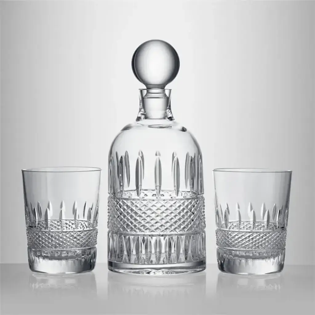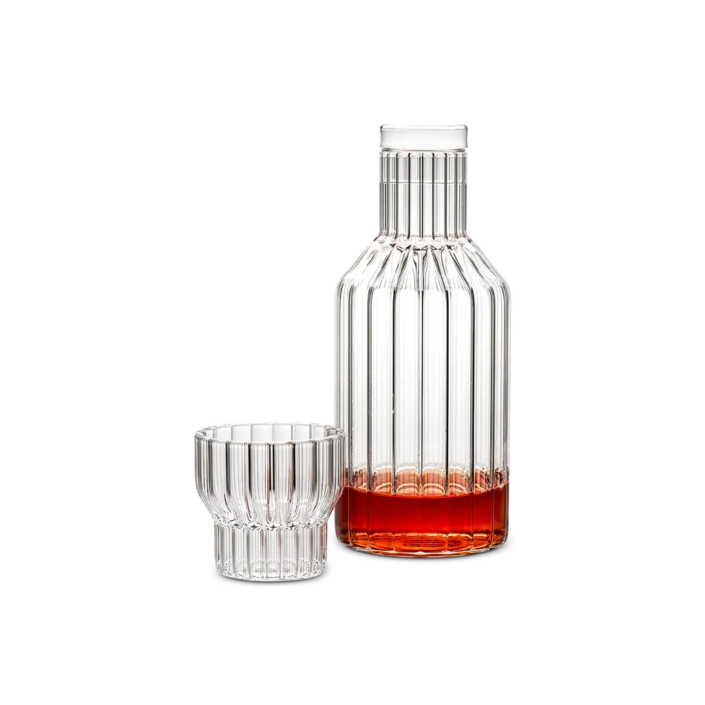 Contemporary mouth-blown whisky tumblers and a square-shaped decanter, set on an ash wood tray with cork veneer.