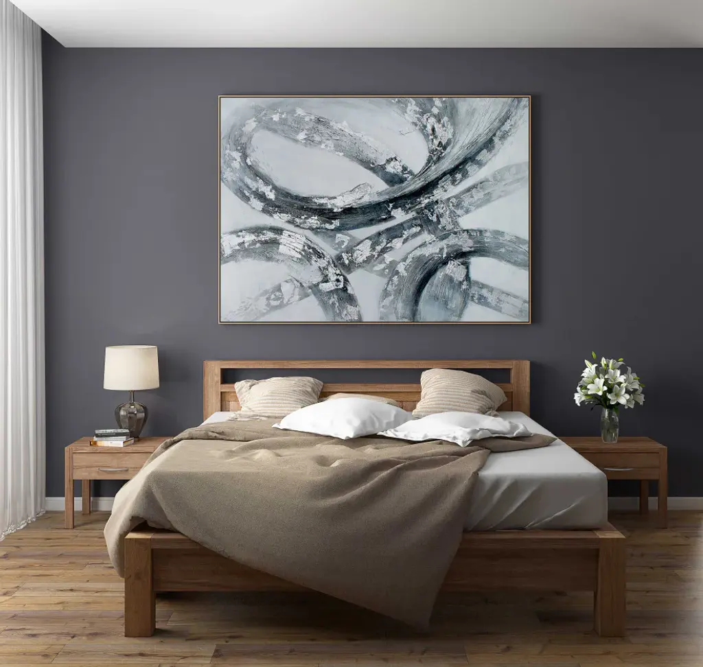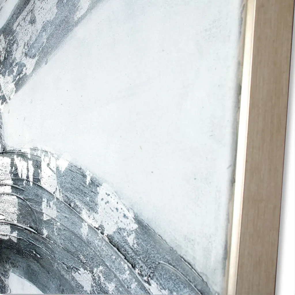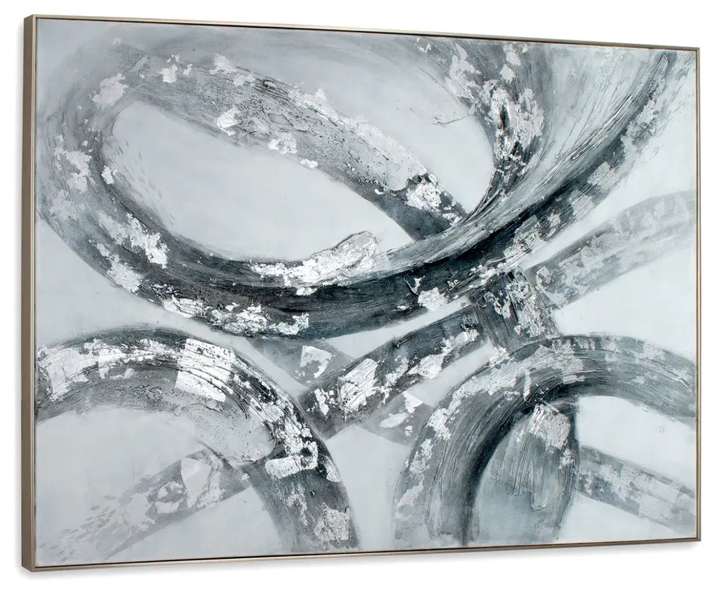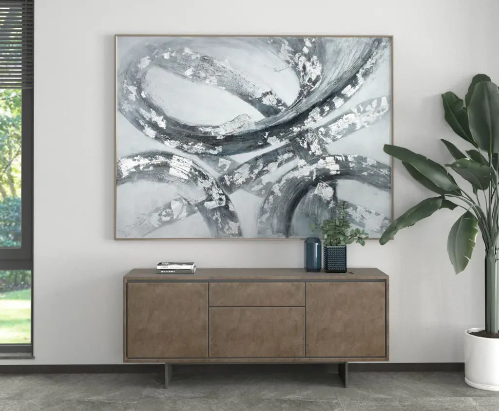 Wow all of your guests with this larger than life, hand painted abstract featuring textured layers of various shades of grey over soft blue tones perfectly accented with metallic silver leafing and silver floater frame•Hand Painted•Frame Color: Silver•PS Frame•Hanging Hardware Included