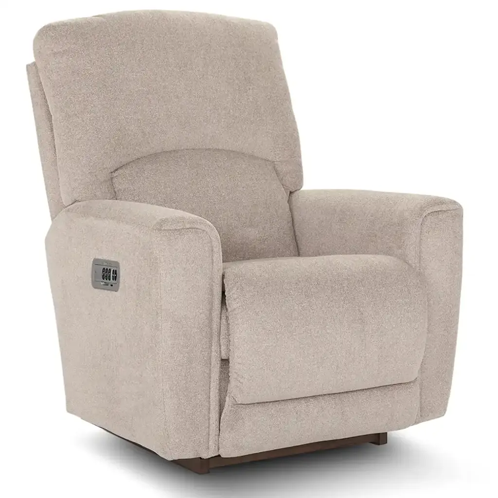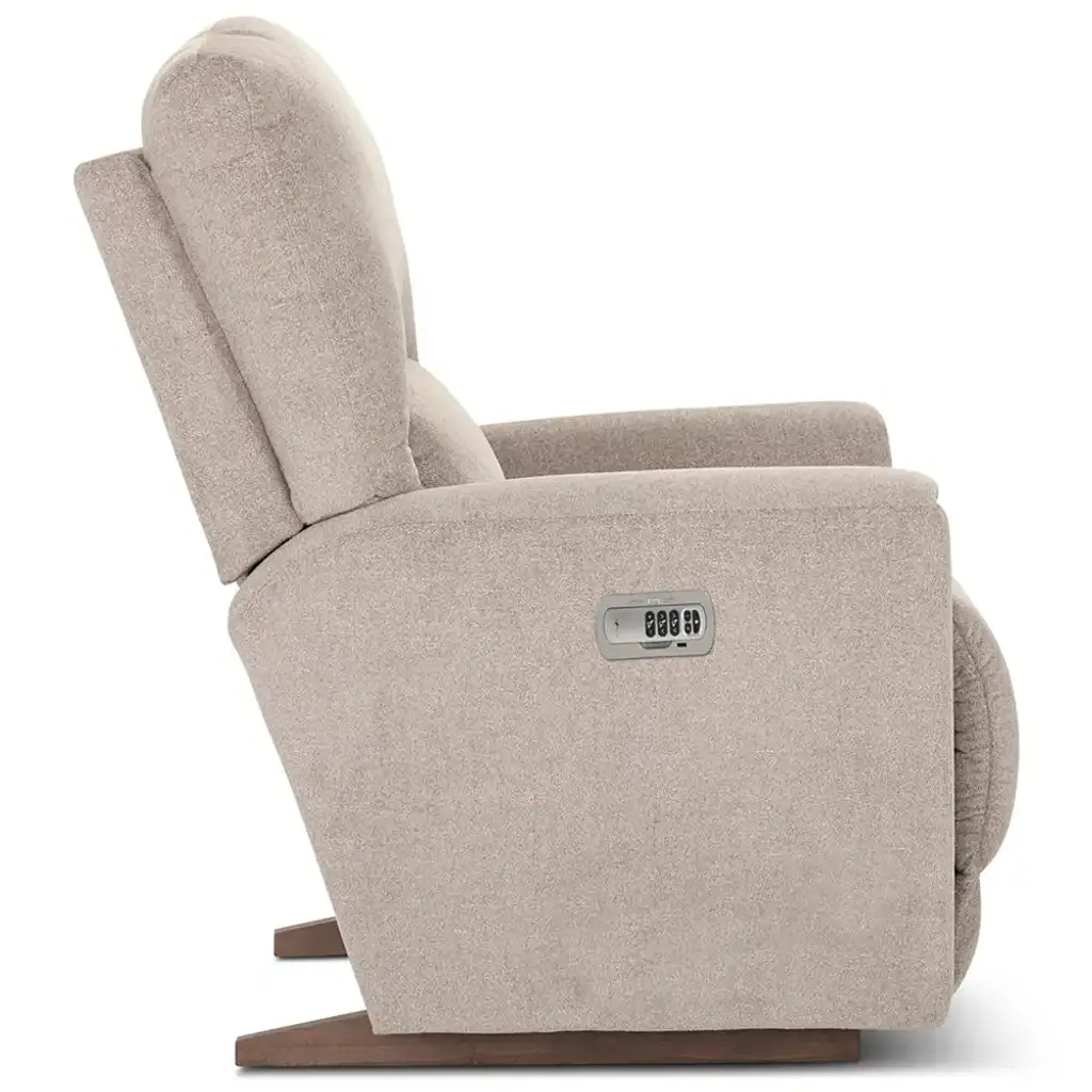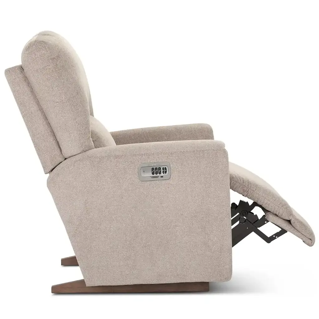 Casual comfort is updated with refined lines in the Cassian Power Rocking Recliner with Headrest. Smooth padding wraps tapered arms and the back has an inset lumbar cushion. Controls ease the head, back and legs to a cozy spot…or just rock and relax.