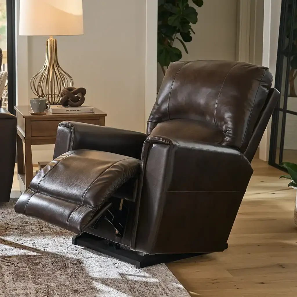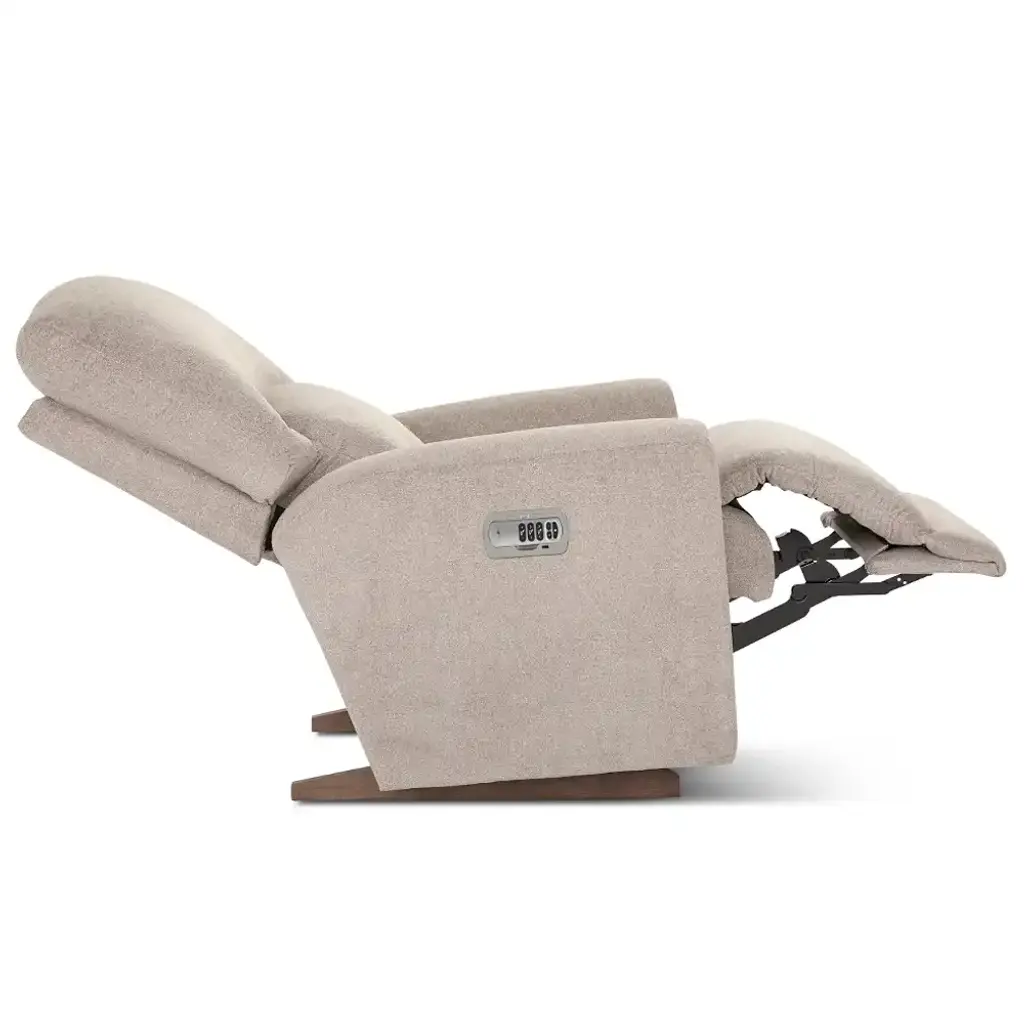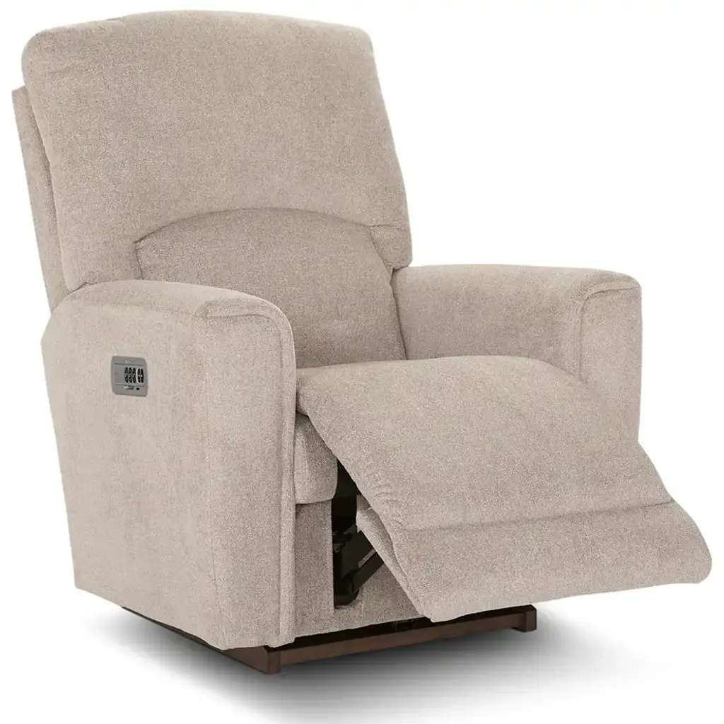 Casual comfort is updated with refined lines in the Cassian Power Rocking Recliner with Headrest. Smooth padding wraps tapered arms and the back has an inset lumbar cushion. Controls ease the head, back and legs to a cozy spot…or just rock and relax.