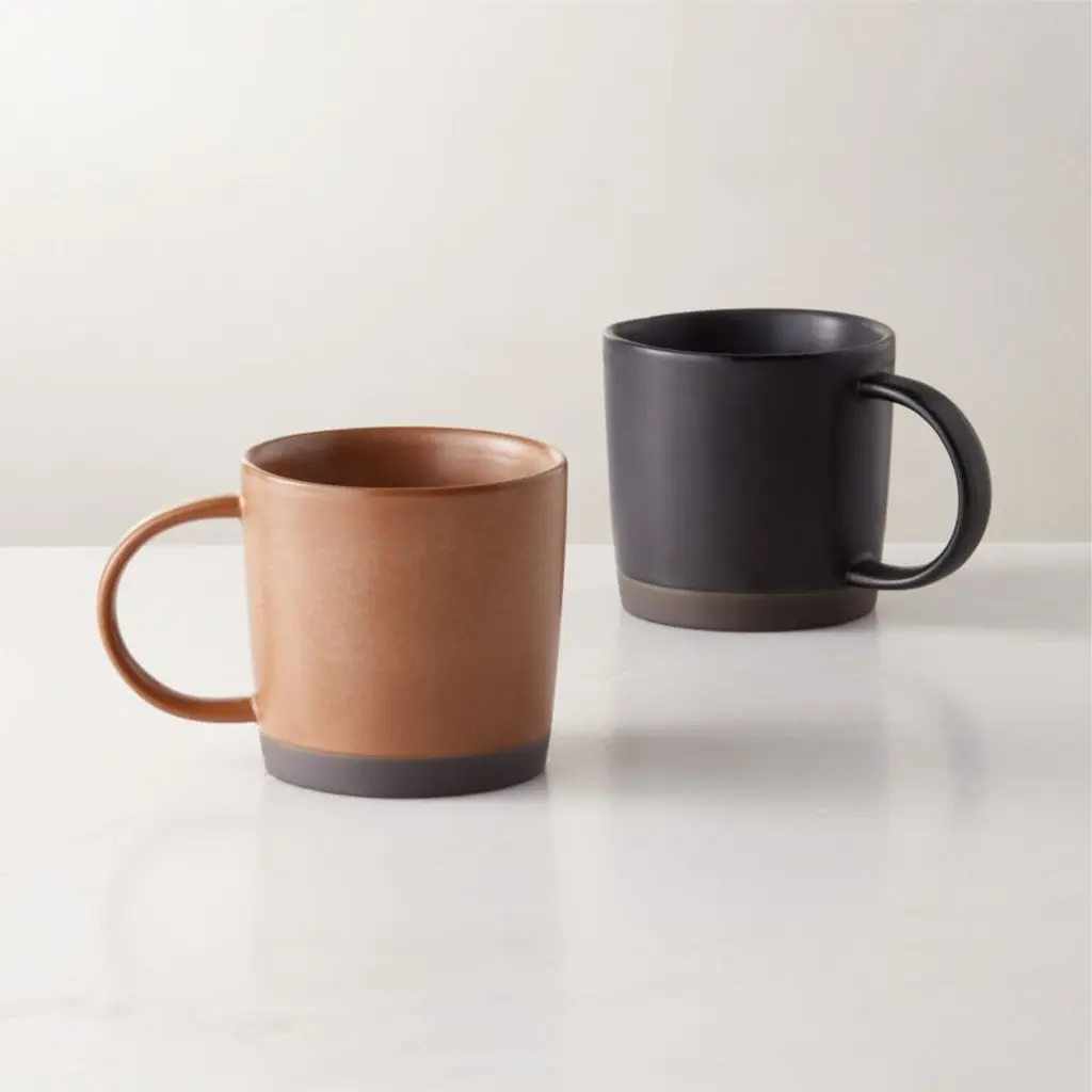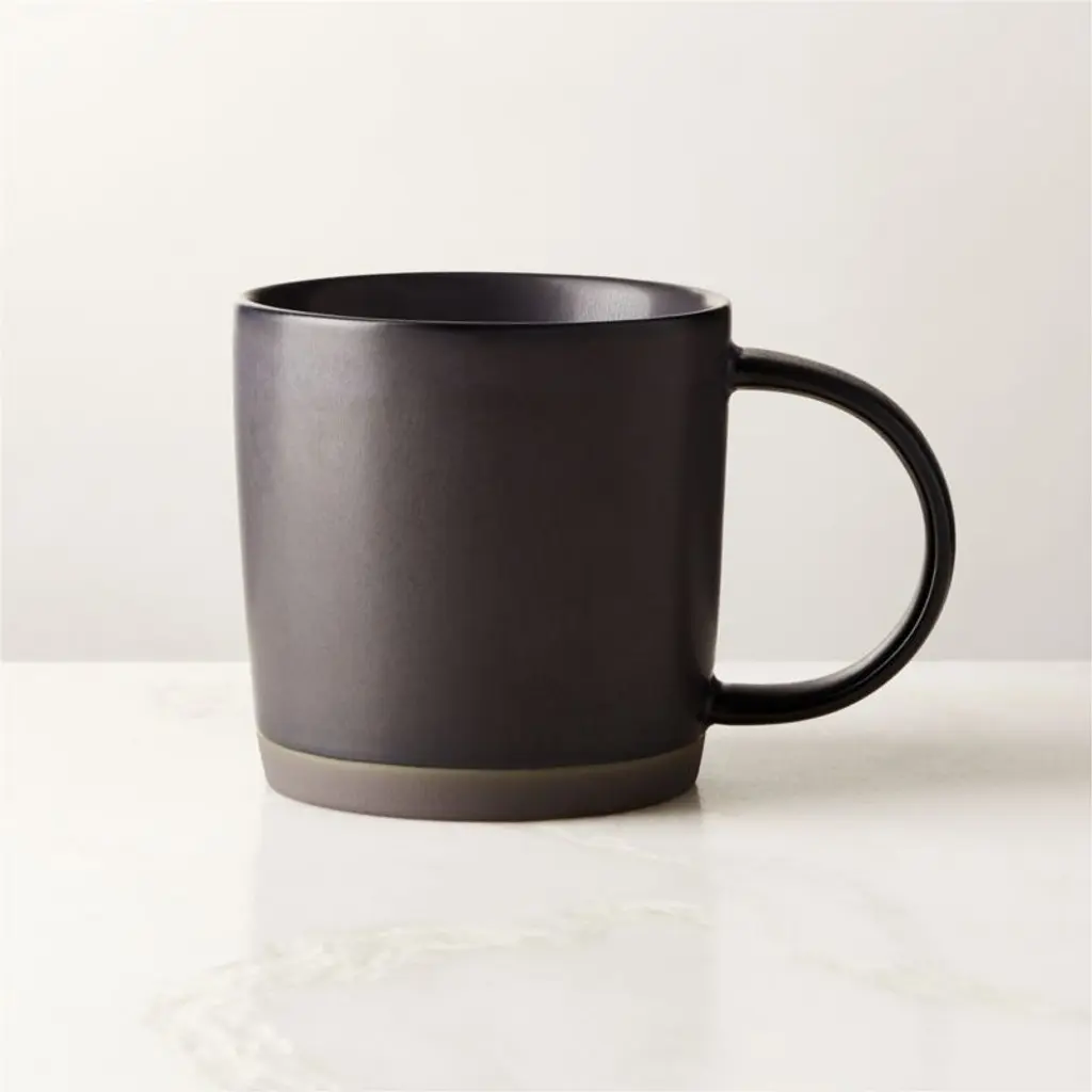 Natural stoneware forms round mug with thin, half-circle handle. Before it's fired, mug is hand-dipped into matte black reactive glaze from top to almost-bottom, leaving a single band of natural grey stoneware at the base. Each will be unique with variation in color and glaze height. CB2 exclusive.