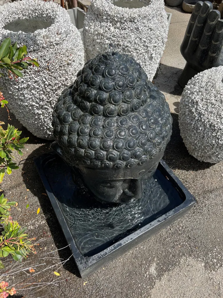 Cast faux stone Buddha head fountain. Perfect for your special outdoor space. Each fountain will have variations in exact tones, textures, and natural imperfections. Includes pump and ready to plug in to your existing electrical outlet. Comes apart for easy installation.