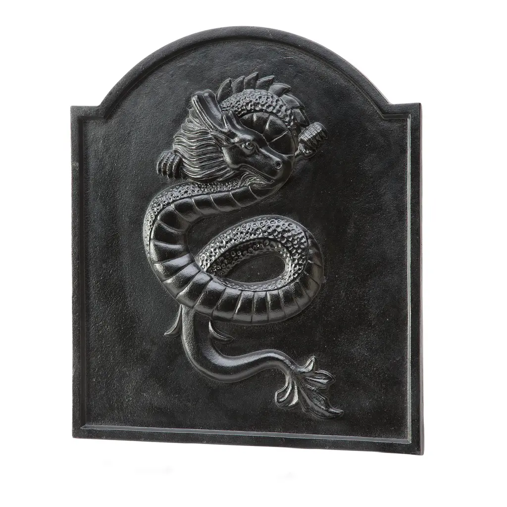 With an exclusive 3D design, our cast iron Dragon Fireback will protect the bricks and mortar of your firebox with unique style.Our Dragon Fireback also increases the efficiency of your fireplace by reflecting more heat into the room and radiating warmth even after your fire has died down. It makes an attractive solution for both wood or gas fireplaces, and has a long-lasting, heat-resistant black finish.Secure your fireback with our cast-iron Fireback Feet, sold separately.