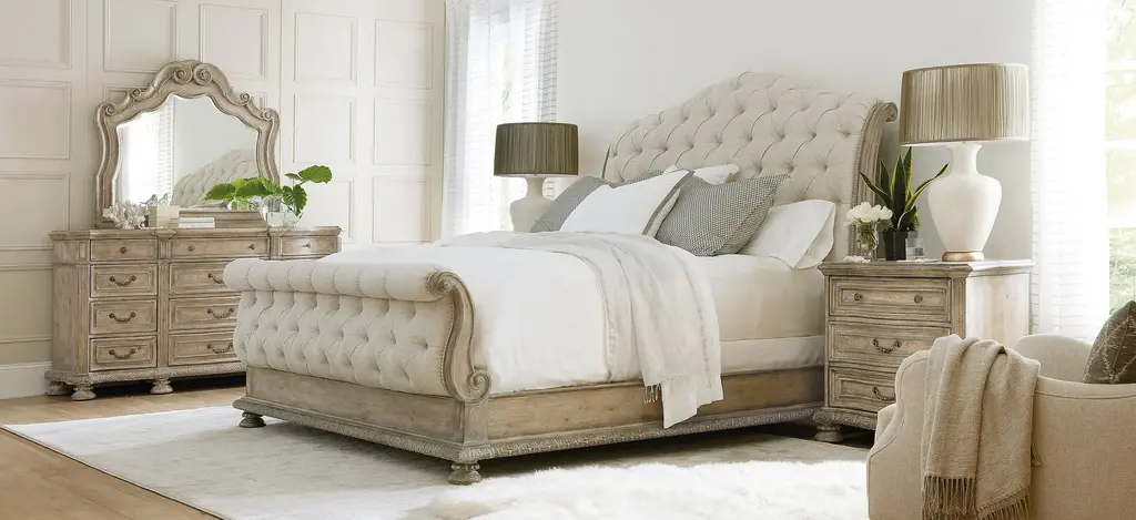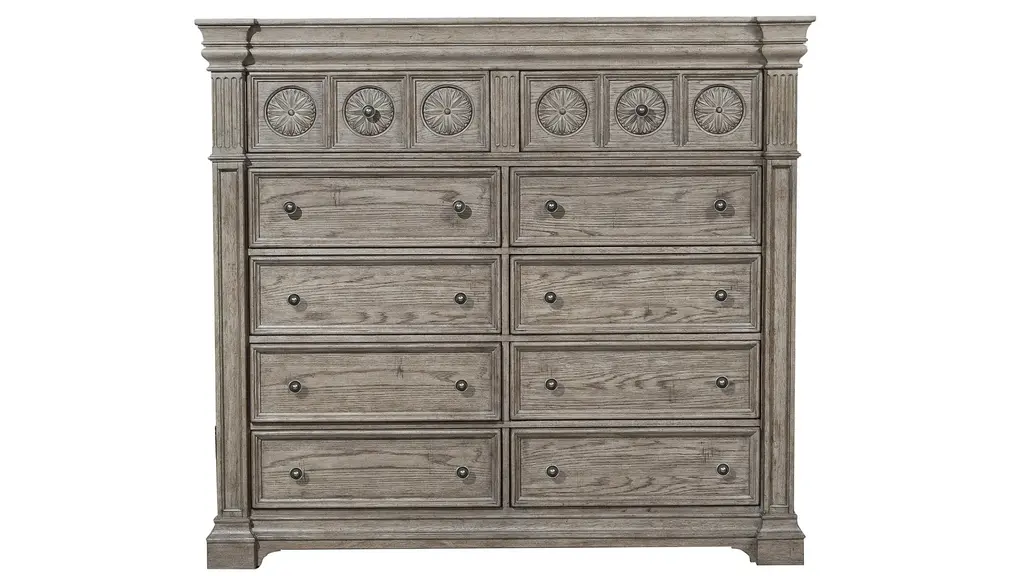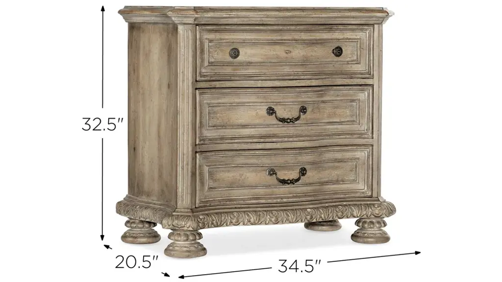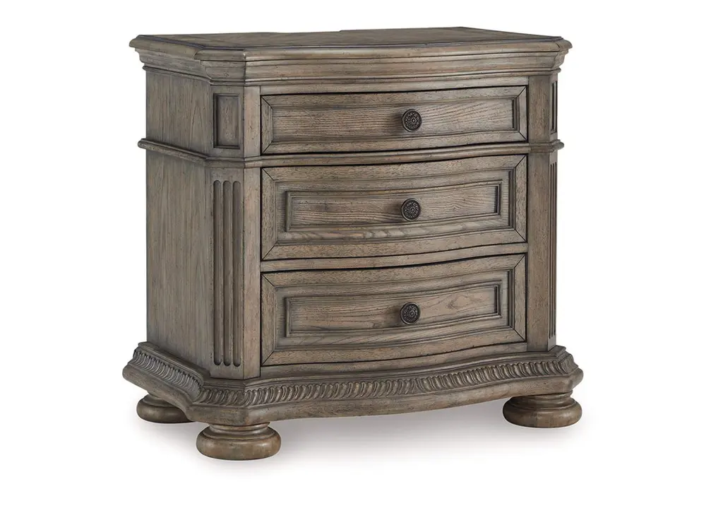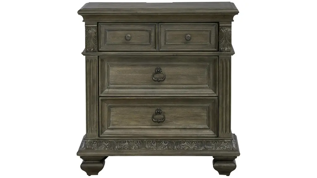 Castella Three Drawer Nightstand brings together classic style elements and a refined rustic finish in an impassioned marriage of casual opulence. Exuberant design motifs such as an acanthus leaf molding around the base, column motifs on the edge of the case and ornate bun feet infuse the piece with emotion. The Antique Slate finish in beautiful patinas has a luminous and fresh appeal. The three drawers include a cedar-lined bottom drawer. On the back is a convenient receptacle and USB port for use with electronic devices, and a light that illuminates from the bottom of the nightstand offers ambience.