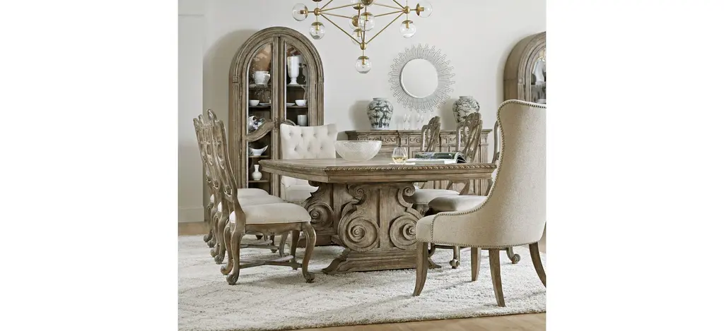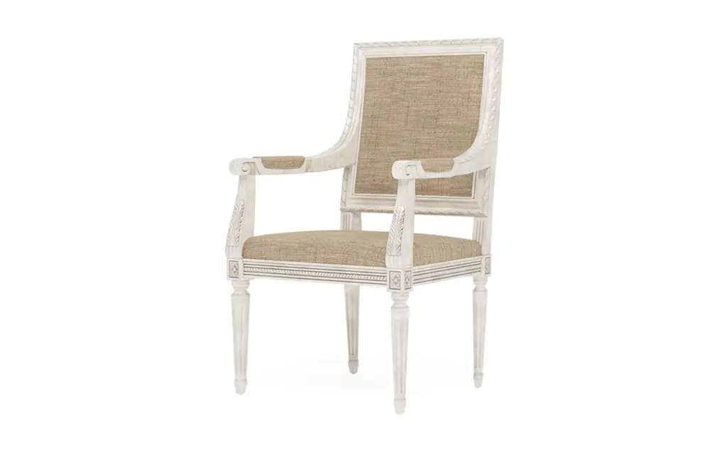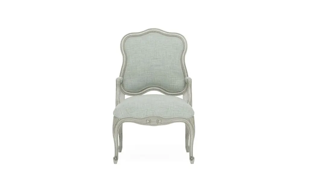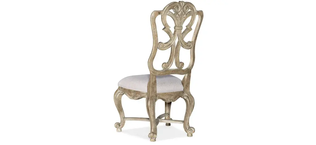 From the fleur-di-lis fretwork back to the scalloped apron to the curvaceous cabriole legs and X-stretcher, the Castella Wood Back Side Chair is adorned with classic design details that make it a work of art. A neutral-colored performance fabric upholstery provides for hours of lingering comfortably at the table, while the Antique State finish has a beautiful patina and a look of laid-back luxury.