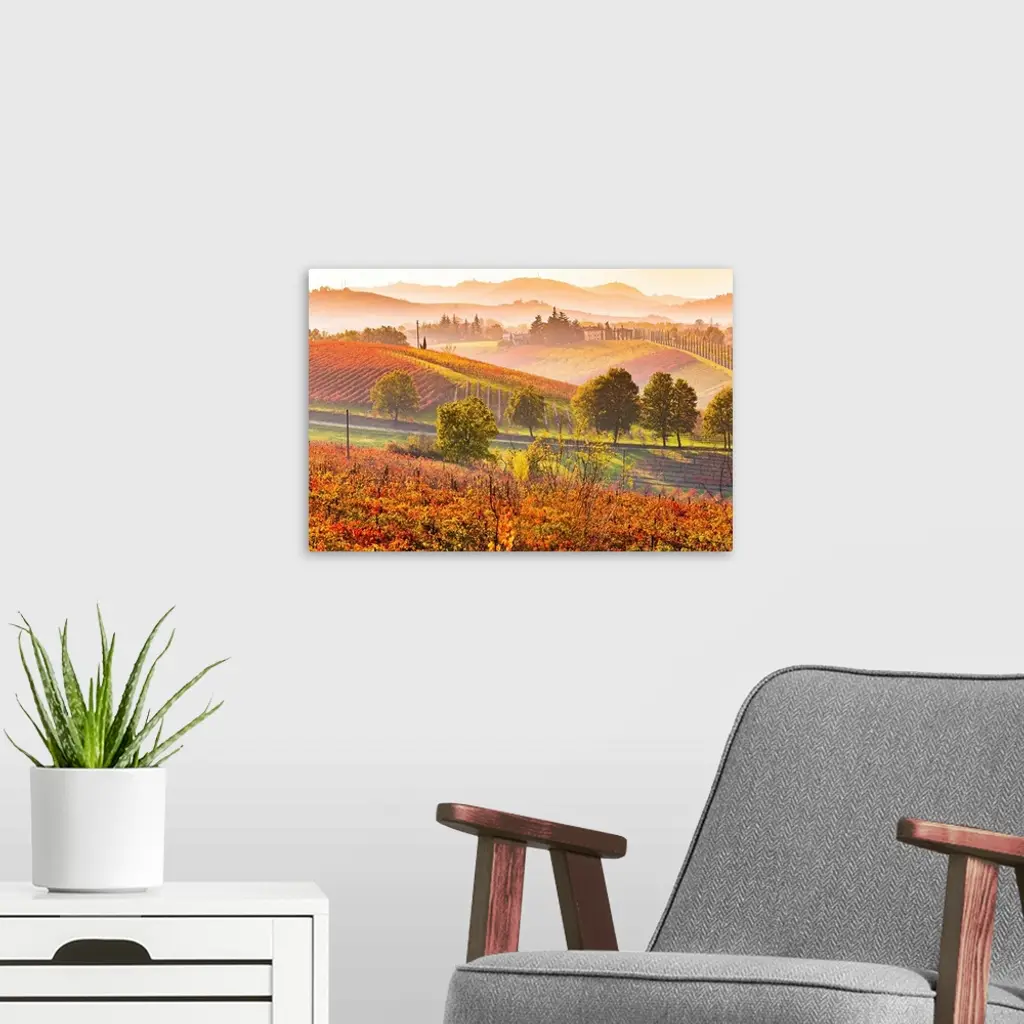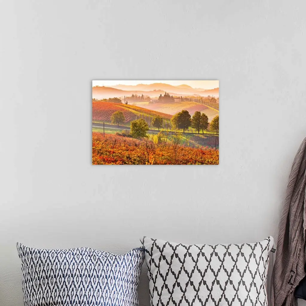 Castelvetro, Modena, Emilia Romagna, Italy. Sunset over the Lambrusco Grasparossa vineyards and rolling hills in autumn.