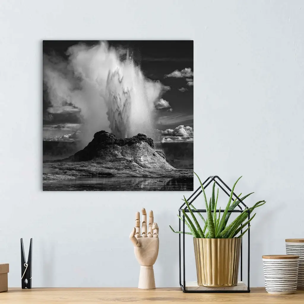 An erupting geyser spewing water and steam into the air, Yellowstone, Wyoming.