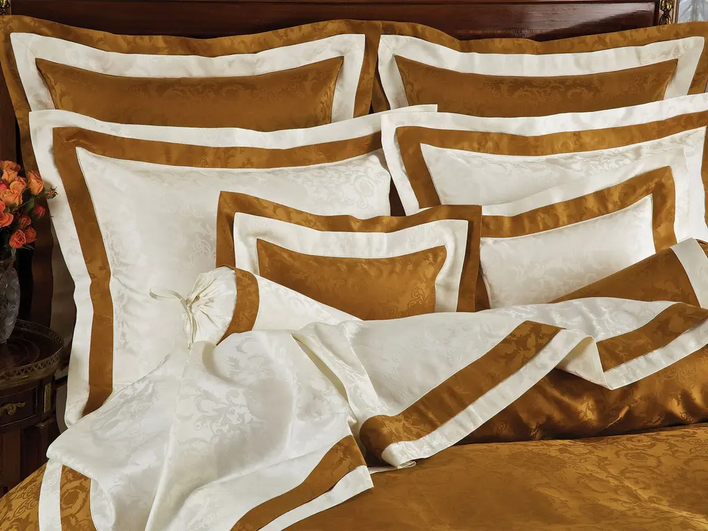 Going beyond posh to the pomp and grandeur of nobility, this marvelous damask of finest Egyptian cotton sateen, 480 thread count, weaves a resplendent paisley motif fit for the most sumptuous surroundings. Masterfully crafted in Italy, the regal effect is enhanced by contrasting overlay borders. To mix or match as you wish, in Copper with Ivory or Ivory with Copper.