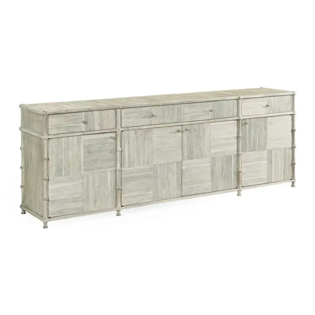 491025-DTM Medium driftwood sideboard in a country style finish on a stepped pedestal base. Four contemporary doors and two shallow drawers. Interior features two double cupboard with a single shelf.