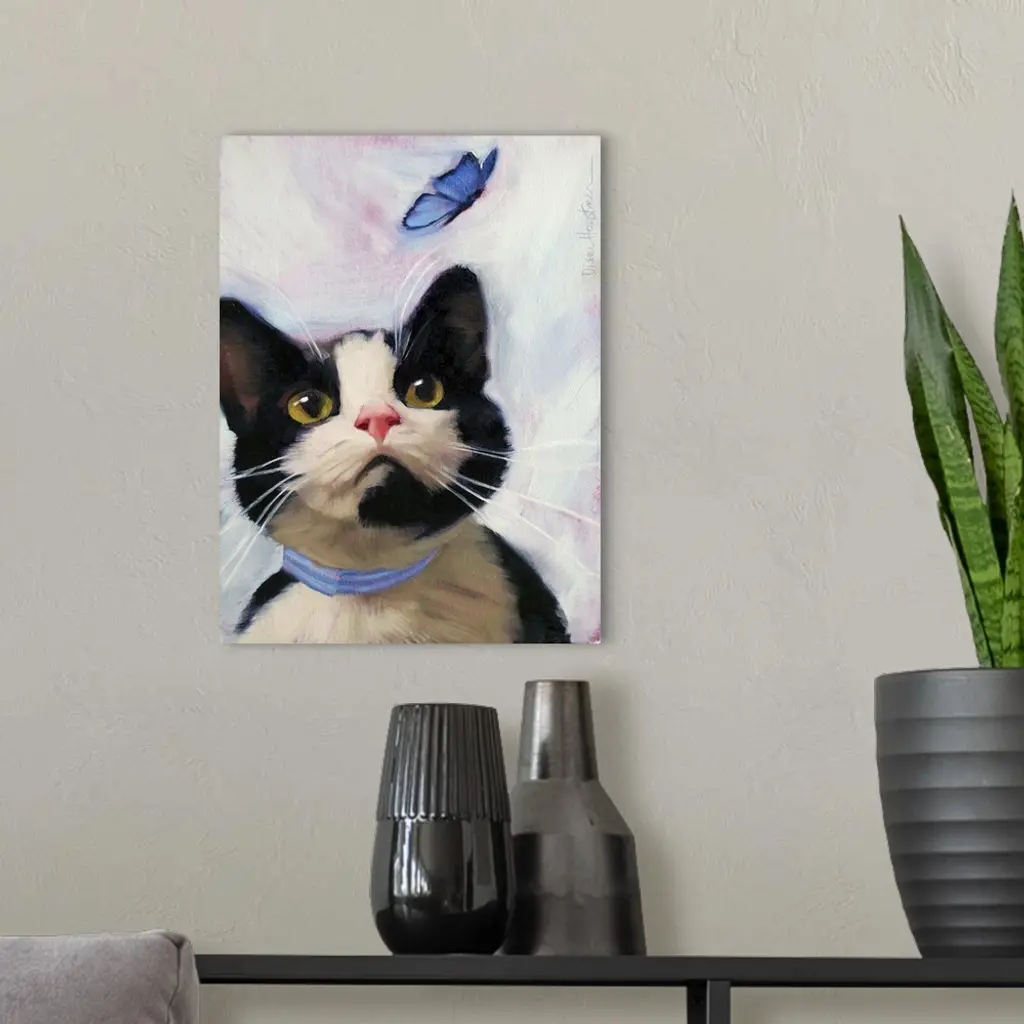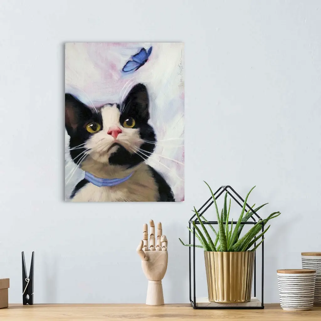 Contemporary portrait of a black and white cat looking at a blue butterfly.