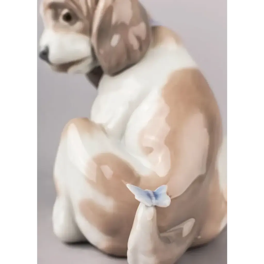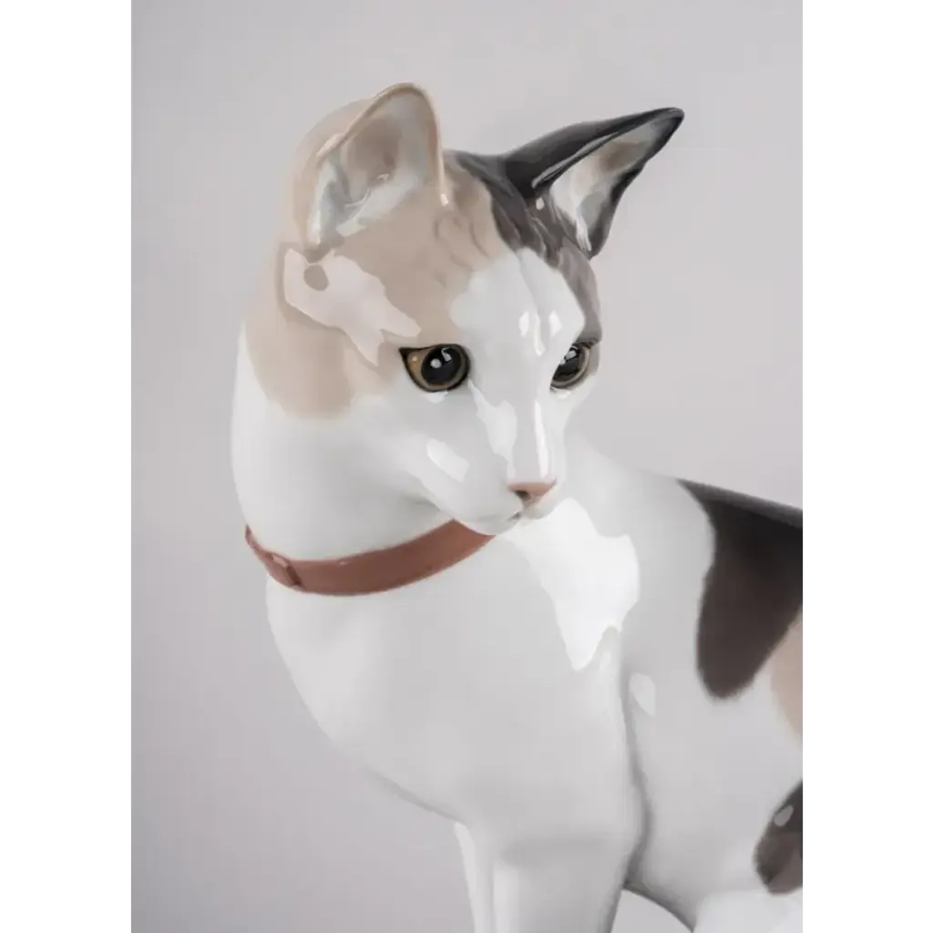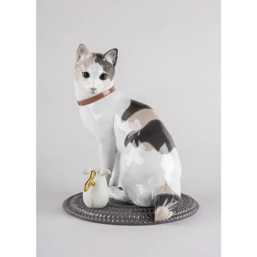Cat and mouse handmade in porcelain, one glazed and the other matte. An iconic Spanish brand, Lladro is a world leader in the creation of porcelain art. Started by brothers Juan, Jose and Vicente Lladro in 1953, the ceramic figurines were initially inspired by the works of great European manufacturers like Meissen and Sevres. Over time, a unique style was forged, consisting of elongated lines, a revolutionary single-firing method, and soft pastel tones.