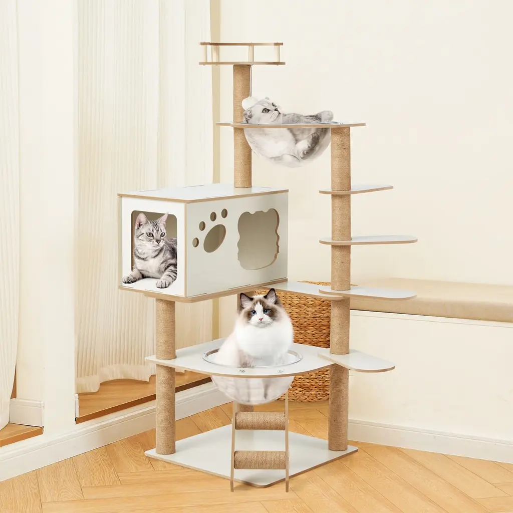 This cat condo features a staircase-like layout with multiple levels, making it suitable for both young and old cats.There is a specially designed, multi-layer structure for cats to scratch, climb, sleep, and exercise. It features three perches for easy jumping, two cozy fluffy hammocks for stretching, sisal-wrapped scratching posts with hanging play balls, and a spacious condo for luxurious napping.Furthermore, Two ladders are added to enhance the play scene for your lovely cats.【Easy to Assemble】Our Cat Tree comes with detailed graphic instructions for effortless installation, allowing you to set it up in just a few minutes! You can rest assured that assembling our cat condo will be a breeze!【Multiple-use Cat House】 There is a specially designed, multi-layer structure for cats to scratch, climb, sleep, and exercise. It features three perches for easy jumping, two cozy fluffy hammocks for stretching, sisal-wrapped scratching posts with hanging play balls, and a spacious condo for luxurious napping.Furthermore, Two ladders are added to enhance the play scene for your lovely cats.