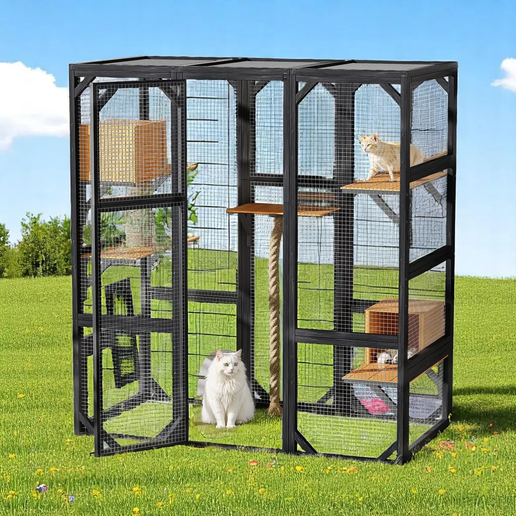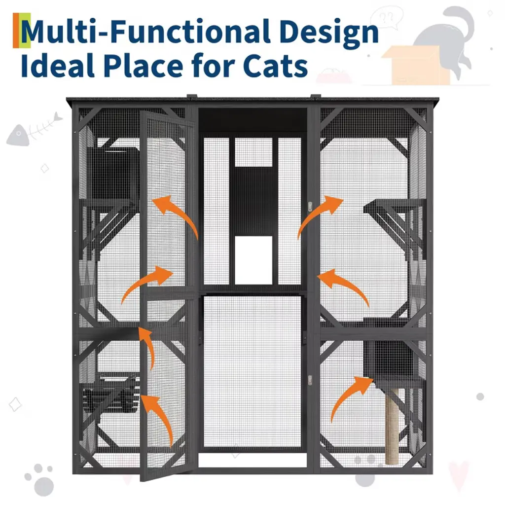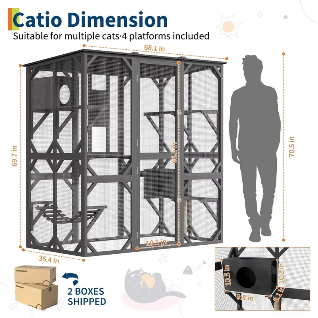 1.User-Friendly Walk-In Design for Easy Interaction & Care This large wooden catio features a 66.5-inch high front door¡ªtall enough for adults to enter without bending, eliminating the hassle of crouching to tend to your cat. The walk-in layout makes daily tasks a breeze: you can easily play with your cat, refill food/water bowls, clean litter boxes, or even join them for a quiet moment in their outdoor space. Whether you¡¯re checking on a nervous kitten or bonding with an older cat, the accessible design fosters closer human-feline connection while simplifying routine care. 2.Multi-Purpose Features to Satisfy Cats¡¯ Natural Instincts Built to cater to what cats love most, this enclosure includes a durable sisal post (ideal for scratching to keep claws healthy and furniture protected) and a cozy swing hammock (perfect for lounging in the sun or napping). It also has two napping houses at different heights¡ªone for cats who prefer high, sunny perches and another for those who seek private, low-key spots to curl up. Plus, the 4 jumping platforms encourage climbing and exploration, keeping active cats entertained and preventing boredom, even when they¡¯re outdoors. 3.Spacious Dimensions for All Cat Breeds & Ages Measuring 68 inches (L) ¡Á 36.4 inches (W) ¡Á 70 inches (H), this catio offers ample room for cats of all sizes¡ªfrom tiny teacup breeds to large Maine Coons¡ªand ages, including playful kittens and less mobile senior cats. The open interior lets cats run, stretch, jump between platforms, or simply wander without feeling cramped. Unlike small cages that restrict movement, this spacious enclosure mimics a natural outdoor environment, allowing your cat to express their full range of behaviors while staying safe from predators or traffic. 4.Raised Shelf Design for Organized, Stress-Free Care (Great for Travel) The catio¡¯s raised shelf design creates under-shelf storage space, easily fitting taller items like large litter boxes, automatic feeders, or water fountains. This keeps essential cat supplies organized and out of the way, maintaining a tidy space for your pet. For pet parents who travel, this setup means you can leave your cat with a familiar, fully stocked environment¡ªno need to rearrange supplies or worry about access. The raised design also makes cleaning under the shelf simple, ensuring the catio stays hygienic for long-term use. 5.Window-Connected Passage for Safe Indoor-Outdoor Access Upgraded with a dedicated indoor-outdoor passage, this catio can be attached to your home¡¯s window or existing pet door¡ªletting your cat move freely between inside comfort and outdoor exploration. The stepped design of the passage is gentle on paws, making it easy for kittens, senior cats, or cats with mobility issues to climb up and down without strain. This safe access lets your cat enjoy fresh air, bird-watching, or sunbathing while staying protected from outdoor dangers, blending the best of both worlds for your feline friend.