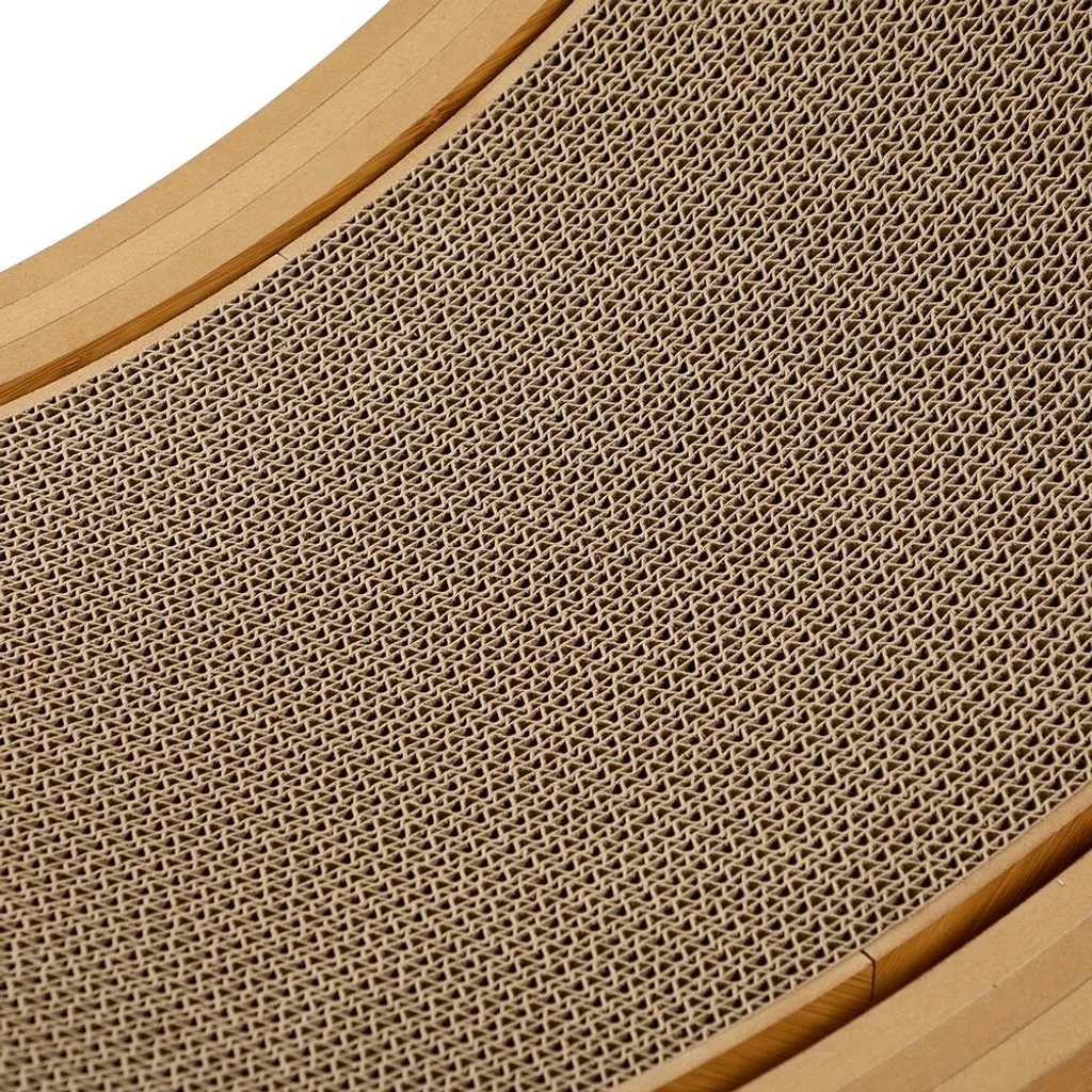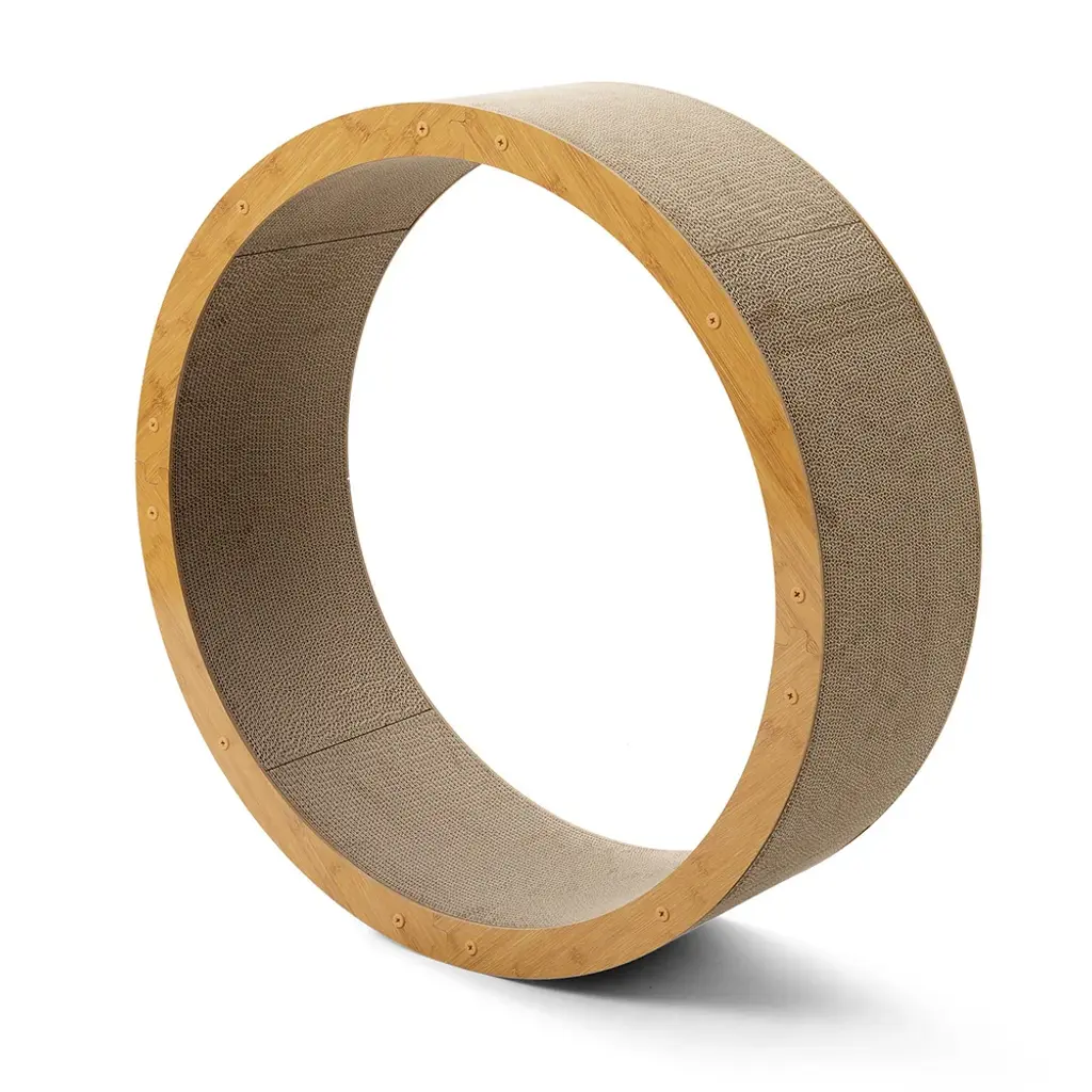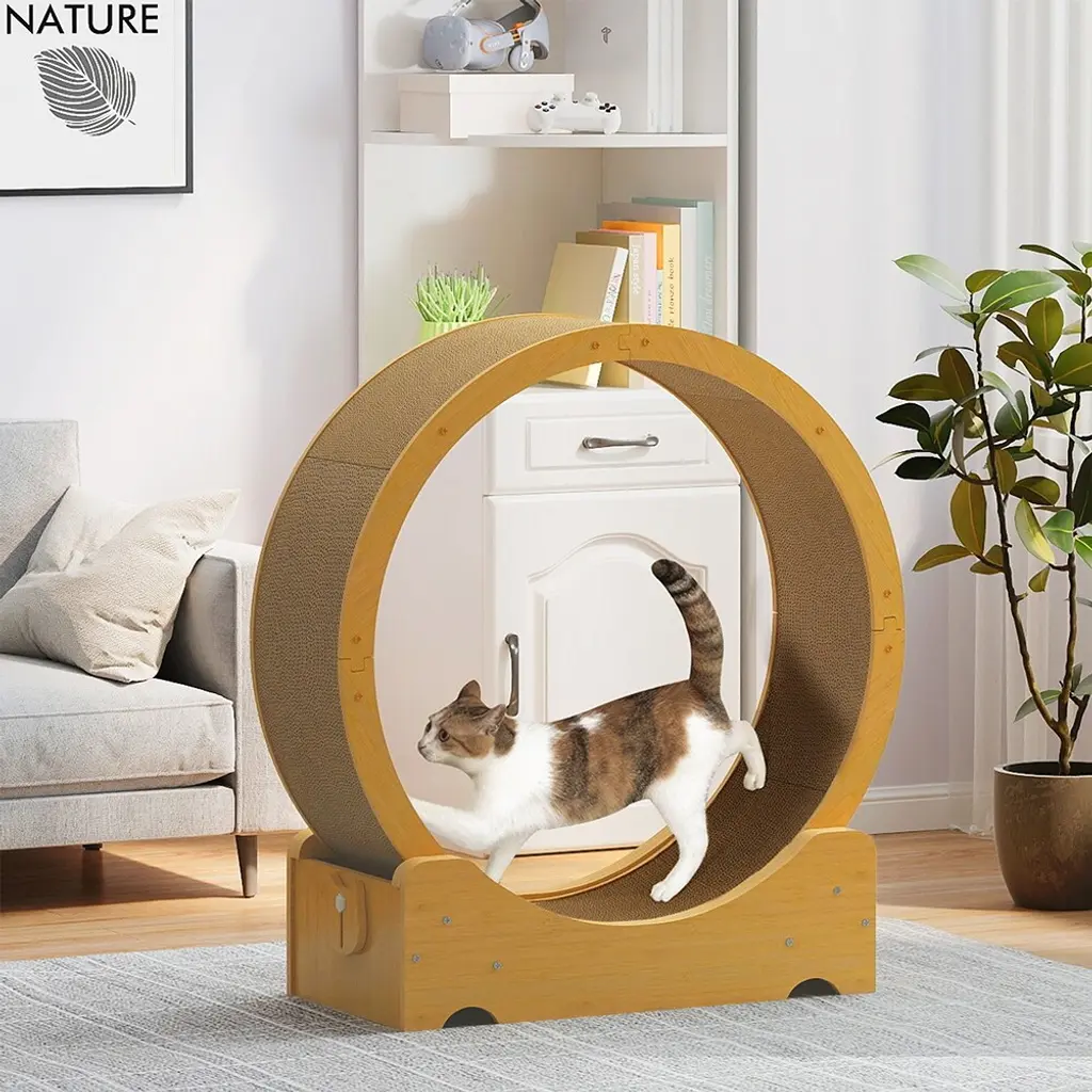 The Cat Scratching Pad is a versatile and functional piece of equipment designed specifically for cats. This exercise wheel provides a fun and engaging way for cats to burn off energy, while the scratching pads offer a satisfying scratching surface for their natural scratching instincts. Features: 【Keep Cats Healthy at Home】: Designed for your energetic cats to run on, this cat exercise wheel not only provides a convenient spot for you to train your feline friends to avoid obesity but also helps kitties to alleviate stress and boredom. 【Double-Sided Cat Furniture】: The claw-friendly and premium corrugated cardboard on the runway, doubled as cat scratchers, offers high traction and can be used on both sides, making the pet treadmill a long-lasting and functional investment. 【Cats' Safety Comes First】: Made of robust MDF, the cat sports wheel with a wide wood base is stable to support up to 27 lbs. The gap between the running wheel and the base has been minimized, effectively preventing feet pinching when climbing up and down. 【Provide a Peaceful Night】: Featuring a lock device, the indoor treadmill allows you to fully control the exercise time. 8 built-in silent pulleys in the base ensure minimal running noise even during nighttime. 【Easy to Assemble】: According to the step-by-step manual, you can install the cat wheel easily. With a 11.02" width and a 29.92" inner diameter, the runway gives your cats plenty of room to run regardless of their size. Specifications: Color: Natural Material: Corrugated Cardboard + MDF Overall Dimensions: 34.45"L x 14.37"W x 38"H Wheel Diameter: 34.45" (Overall), 29.92" (Inner) Runway Width: 11.02" Max. Weight Capacity: 27 lbs Net Weight: 22.5 lbs Package includes: 1 x Cat Scratching Pad 1 x Instruction Manual