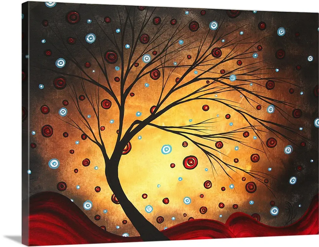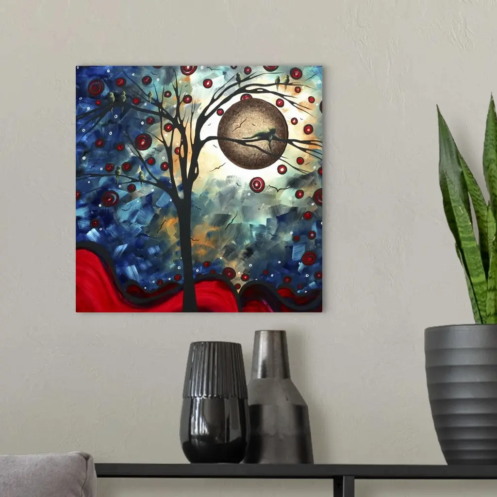 A cat and several birds are perched in a frail tree that is surrounded by small red circles and a dark moon just behind it.
