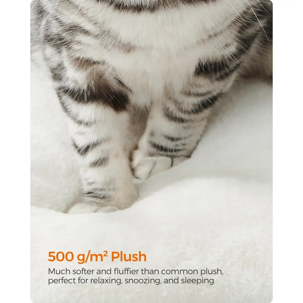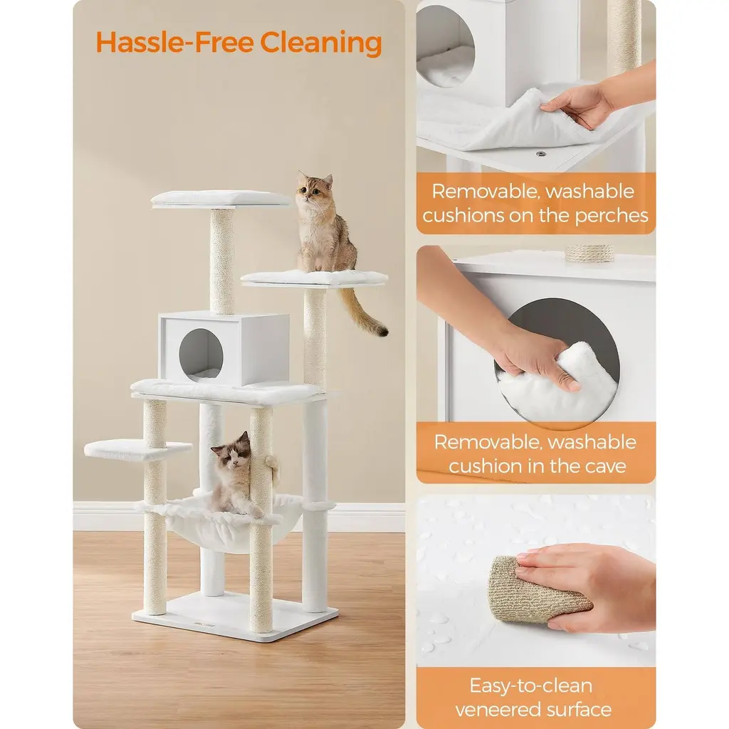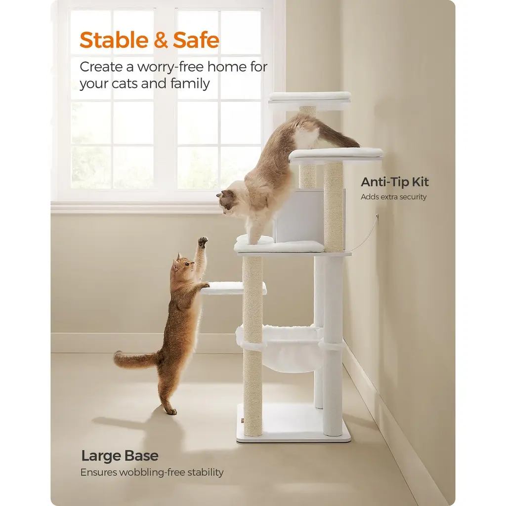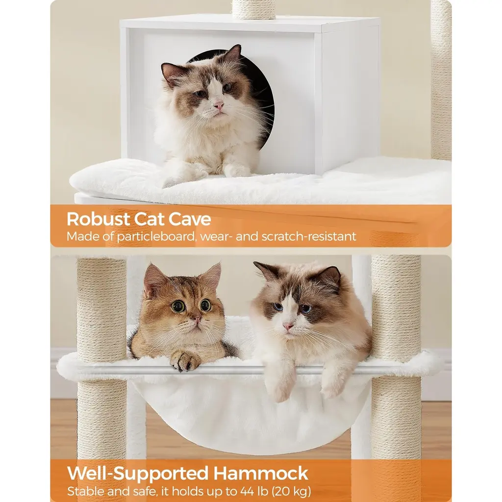 【EASILY BLENDS INTO YOUR HOME】Combining with cloud white, this modern cat tree with scratching posts easily blends in with most home styles and gives your space an upgrade 【EASY CLEANING】Remove the cushions on the perches and in the caves for washing, and clean the smooth veneered surface with a cloth—keeping this piece of cat furniture clean is easy as 1-2-3 【NEXT-LEVEL COMFORT】The cushions and hammock are made of 500 g/m² plush—even softer and fluffier than common plush—so your furry friends can play, relax, and snooze in ultimate comfort 【WEAR- AND SCRATCH-RESISTANT】Crafted with veneered particleboard, this cat play tower is wear- and scratch-resistant for restless claws and durable for lasting joy 【STABLE AND SAFE】With a metal-frame-supported hammock, anti-slip pads on the bottom, and an anti-tip kit—this cat condo with a max. static load capacity of 88 lb is stable and safe for up to 4 cats (max. 15.4 lb each) to climb up and down