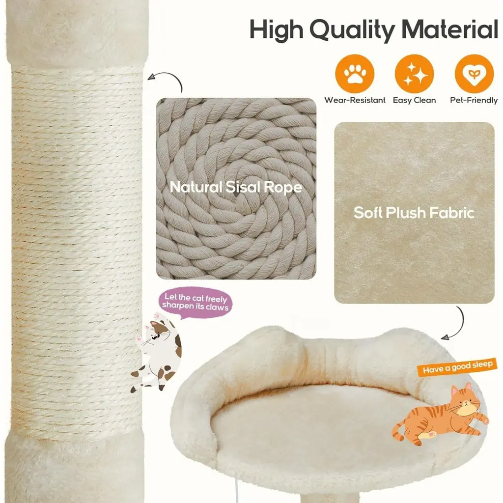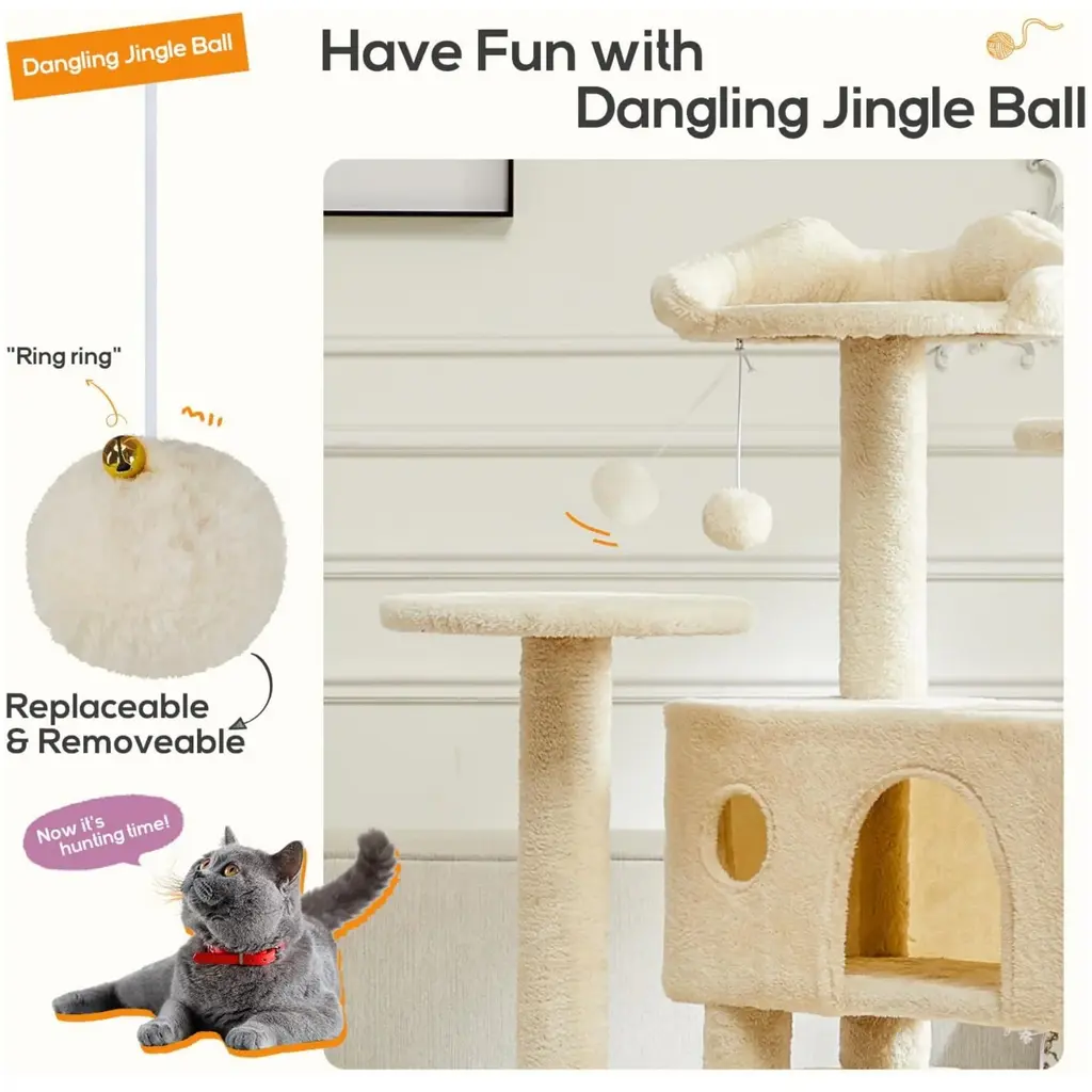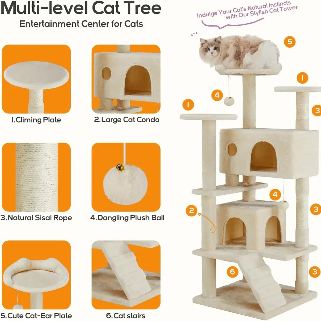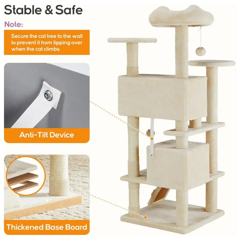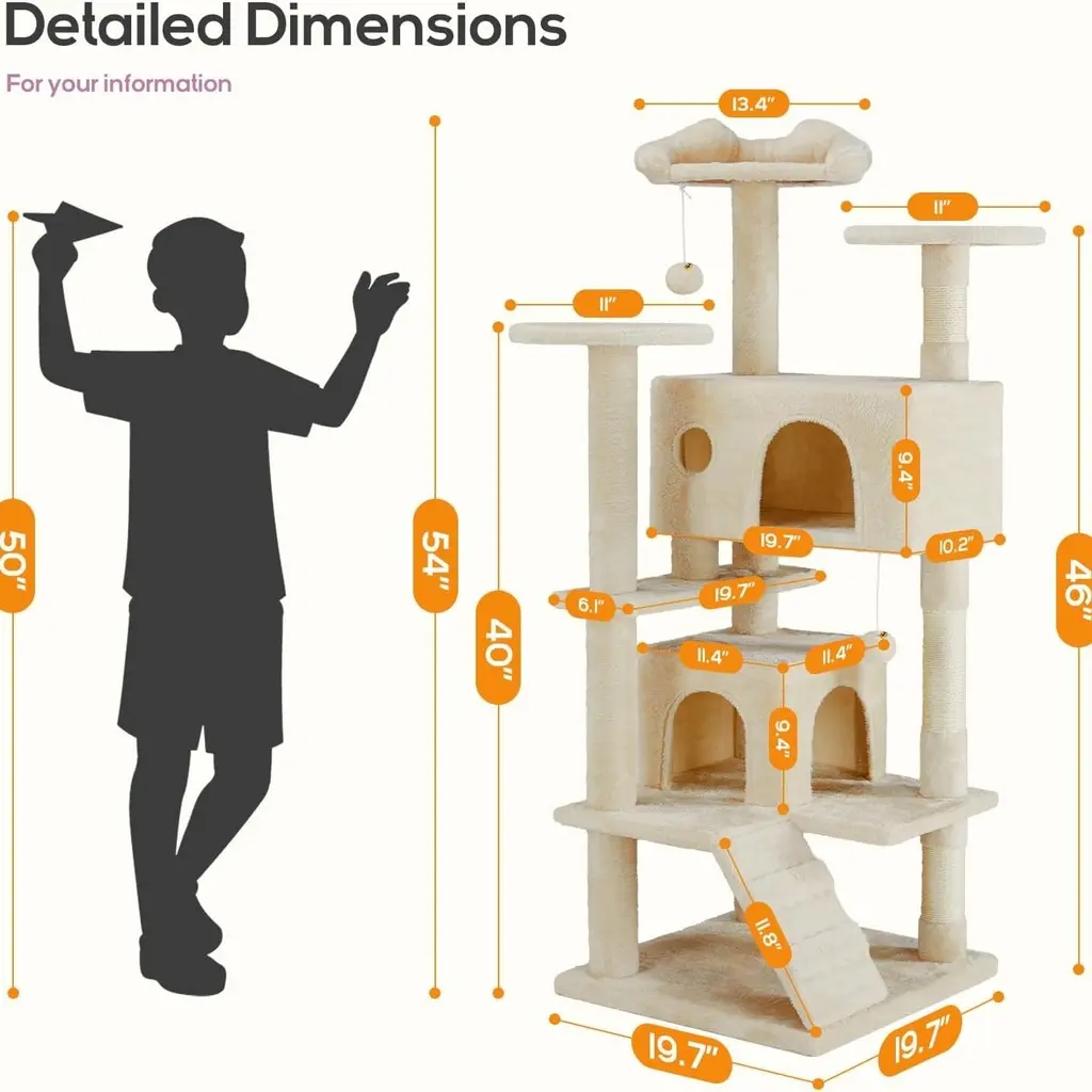 Description:The 54-inch cat tree is the perfect playground for your indoor feline friends. This multi-level cat tower features a sisal scratching post to keep your cat's claws healthy and sharp. The large kitty condo provides a cozy space for your cat to nap and relax.With a climbing ladder and plush platforms, your cat will have plenty of room to climb, jump, and play. This cat tree is sturdy and stable, ensuring your cat's safety as they explore and have fun. Give your cat the ultimate playhouse with this 54-inch cat tower. Your furry friend will thank you for it!Multi-Level Fun: The Cat Tree offers multi-level fun for your feline friend, featuring three top perch platforms and two cozy condos. The three climbable platforms encourage your kitten to explore, jump, and satisfy their natural curiosity, while the two private condos provide a safe, warm, and comfortable space for relaxation after playtime. Perfect for keeping your cat entertained and comfortable, this tree caters to their need for both adventure and rest.Cat's Entertainment Hub: The Cat Tree serves as the ultimate entertainment hub for your feline companions, with three sisal rope pillars that cater to their natural scratching instincts. The dangling balls, equipped with charming bells, invite your cats to engage in playful hunts at their leisure. Additionally, the cleverly designed ramp adds an extra element of excitement and adventure, keeping your pets active and entertained. This thoughtfully crafted tree ensures your cats have everything they need for endless fun and stimulation.Premium Quality Materials: The Cat Tower is made with premium, pet-friendly materials to ensure both comfort and durability. It is covered in thick, plush fabric that keeps your furry friends warm and cozy. The scratching posts are wrapped in natural sisal rope, offering a safe and long-lasting surface for your cats to scratch. For added stability, the base board is reinforced with multiple layers of thick material, ensuring the tower remains sturdy and secure during all your pet's activities.Stable Construction: The Cat Tree features a stable construction, occupying a compact 50x50cm area, making it perfect for smaller spaces. Its vertical design offers plenty of room for 3-4 cats to play and explore at the same time. For added security, the included anti-tilt device allows you to safely secure the cat tree to the wall, preventing any tipping incidents and ensuring your cats' safety during play.Effortless Assembly: The Cat Tree is designed for effortless assembly. With the provided installation manual and complete set of tools, including screws and a wrench, putting it together is simple and straightforward. Each part is clearly labeled with corresponding numbers that match the instructions in the manual, making the process even easier. For additional help, you can also refer to the installation video on this page for visual guidance, ensuring a smooth setup experience.