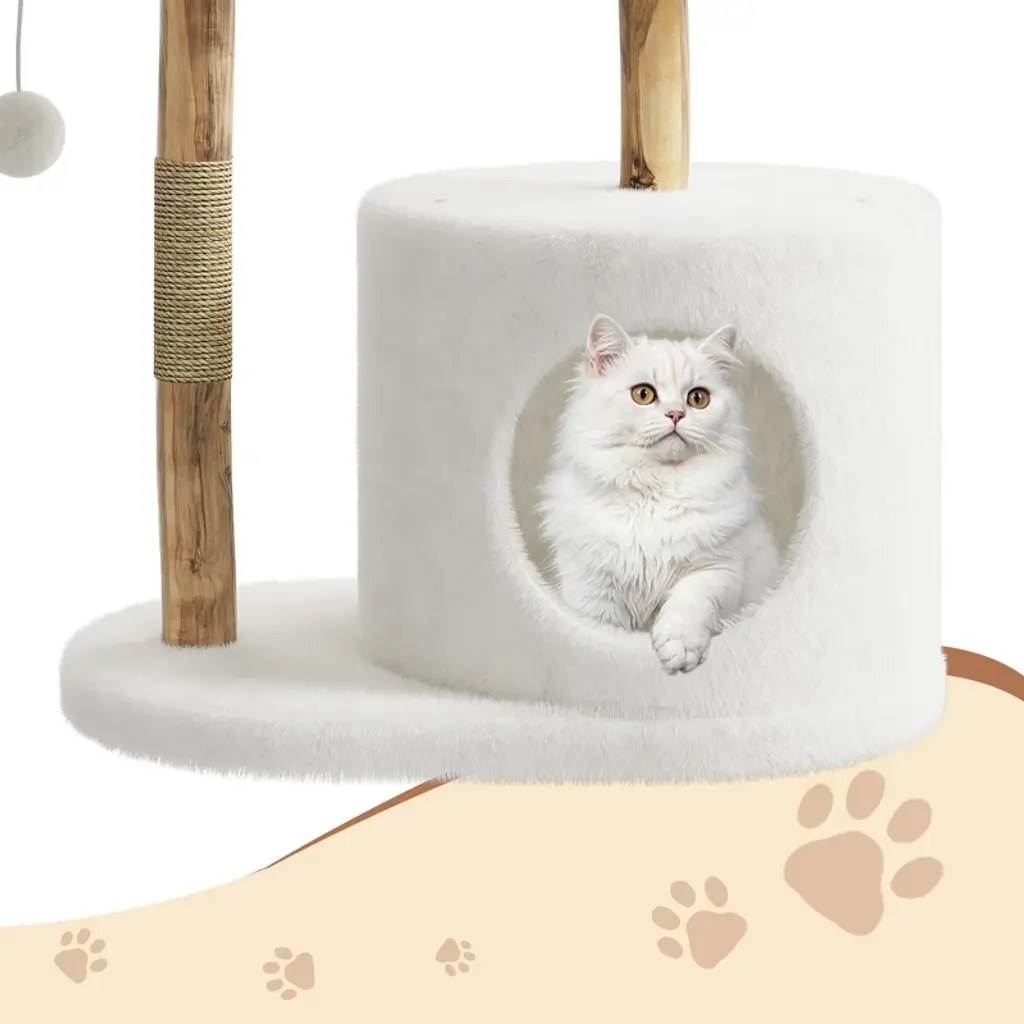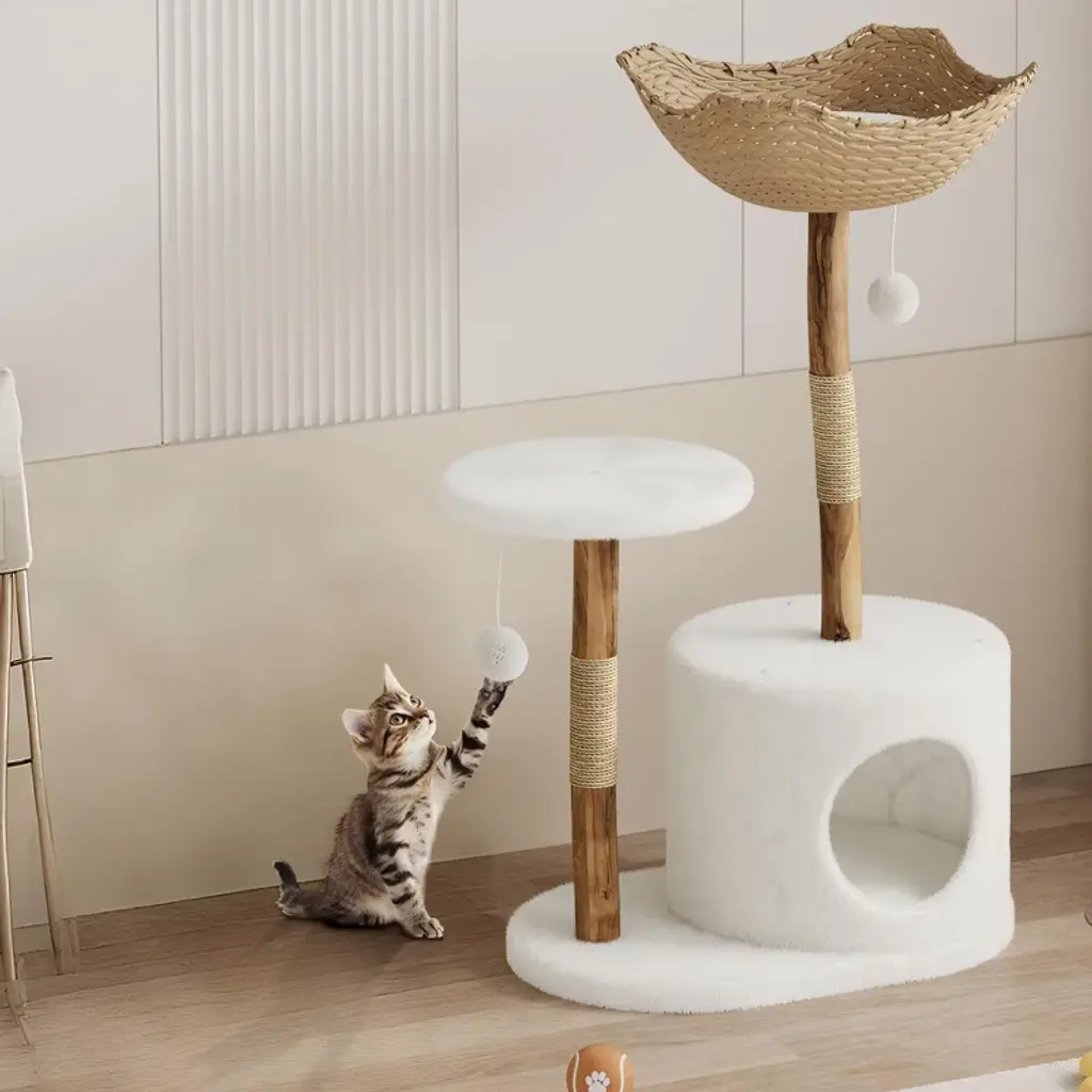 Natural Real Wood Design for Stylish HomesCrafted from real solid wood branches, this modern cat tree boasts a unique, rustic aesthetic that blends seamlessly with various home decors¡ªfrom boho to minimalist. Its natural finish elevates your living space while serving as a functional playground for your cat, ensuring your pet¡¯s furniture complements rather than clashes with your interior style.Multi-Level Play Area for Active CatsDesigned to satisfy your cat¡¯s natural instincts, this wood cat tree features multiple levels and spacious platforms, perfect for jumping, climbing, and perching. Whether your feline loves to observe the room from a high vantage point or dart between levels, the interactive setup keeps them entertained and active, preventing boredom and encouraging healthy movement.Built-In Scratching Posts & Toys for Claw HealthEquipped with sturdy scratching posts, the tree helps maintain your cat¡¯s claw health by allowing them to stretch and sharpen their nails¡ªsaving your furniture from unwanted scratches. Plus, dangling toy balls add extra excitement, keeping your kitty engaged for hours and satisfying their hunting instincts throughout the day.Cozy Wicker Condo for RelaxationIncluded is a plush, natural wicker condo that serves as a cozy retreat for your cat to unwind after play. This enclosed space offers warmth, comfort, and a sense of security, making it the ideal spot for peaceful naps or escaping busy household activity. It balances playfulness with relaxation, catering to all your cat¡¯s needs.Easy Assembly & Space-Saving DesignThis minimalist cat furniture assembles quickly with included instructions and hardware, so you can set it up in no time. Its sleek, compact design fits effortlessly into corners or small spaces, ensuring it adds functionality without overwhelming your home¡¯s ambiance¡ªperfect for apartments, bedrooms, or living rooms.