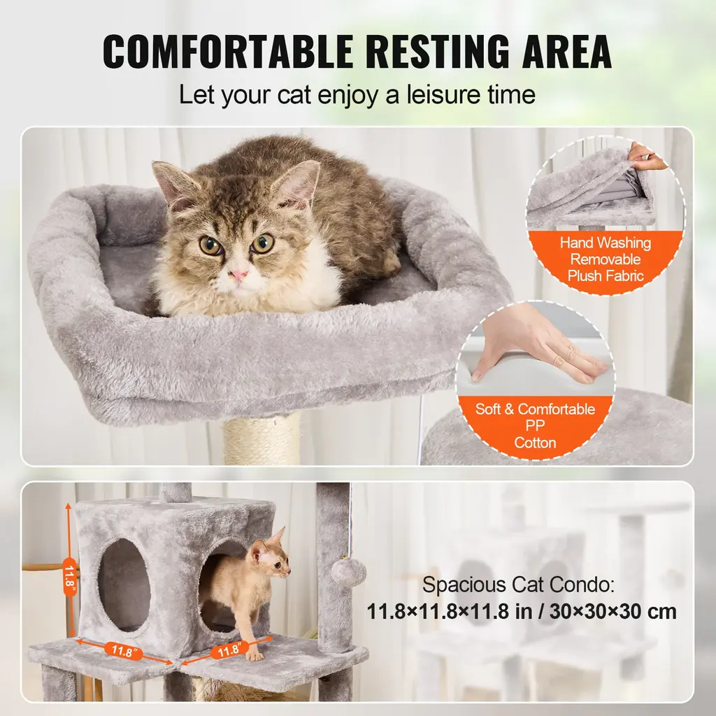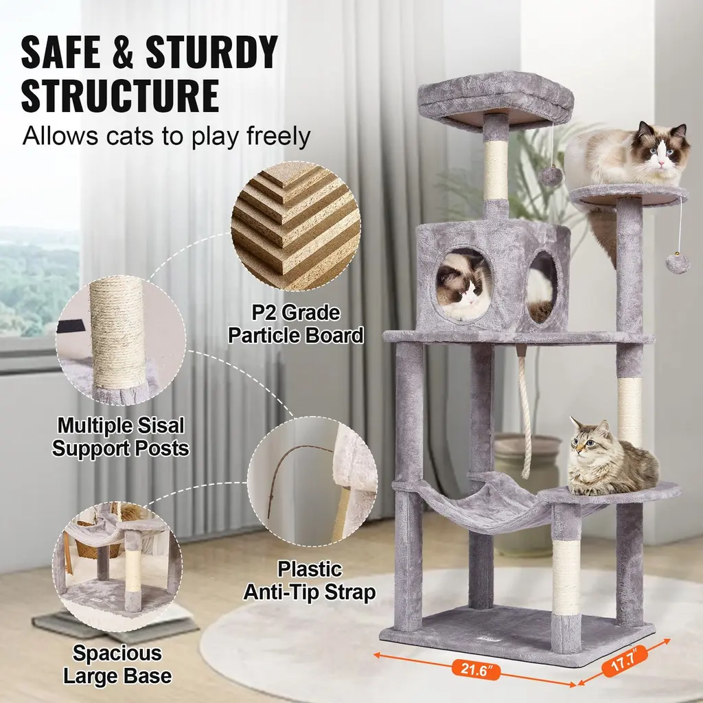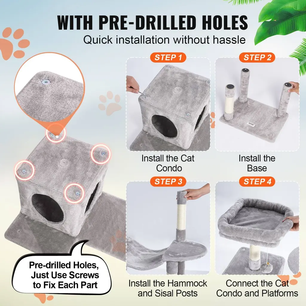 Cat Activity Center: This multi-level cat tree is perfect for 1-4 small to medium-sized cats. Various height platforms allow cats to climb freely, satisfying their exploration needs. Whether the top or the low resting area, every cat can find their ideal space.Cats' Cozy Haven: The cat tower features a spacious cat condo, top perch, and hammock, providing a private and secure resting environment. There are multiple platforms for cats to freely choose where to play and rest. Soft plush surfaces are gentle on cats' skin and claws, ensuring a comfortable lounging experience. Joyful Playtime for Cats: Hanging ball toys and spring balls on the cat scratching tree attract cats' attention, stimulating their playfulness. Sisal-wrapped scratching posts allow cats to stretch and exercise, keeping them active, relieving boredom and stress, and preventing furniture damage. Easy Installation: Pre-drilled holes make installation effortless. Our cat tree for indoor cats comes with detailed assembly instructions and all necessary screws, bolts, wrench, and expansion screw kits. Even first-time users of pet furniture can easily complete the setup, saving time and effort. Safe and Stable: Constructed with P2 grade particle board, the cat house is secure and sturdy. A wide base and thickened sisal poles ensure overall stability. Anti-toppling strap can be fixed to the wall to prevent tipping. Suitable for living rooms, bedrooms, balconies, and courtyards, and also ideal for pet stores, veterinary clinics, and pet grooming salons. Package Content 1 x Cat Tree Tower 1 x Manual 16 x M8*35 Screws 4 x M8*80 Double-Ended Studs 1 x Hex Wrench 1 x Expansion Screw Kit