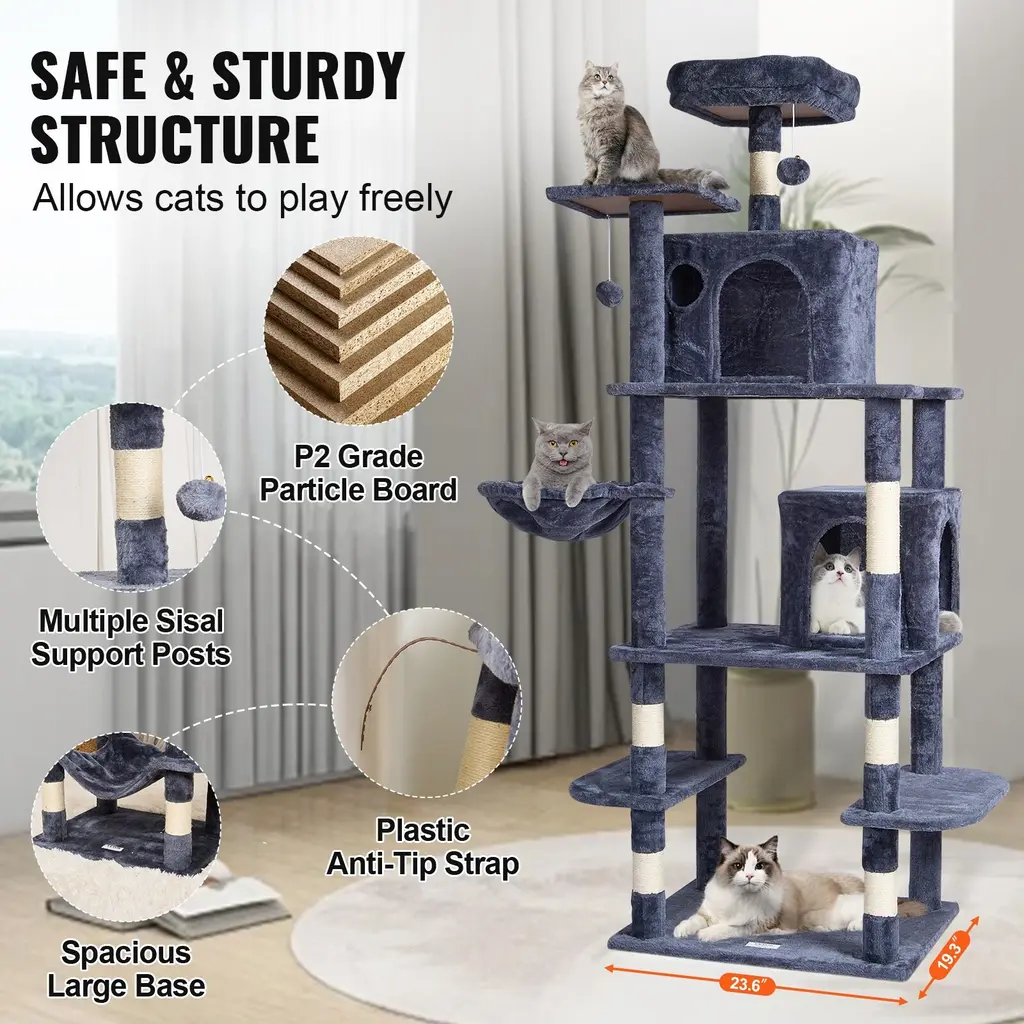 Cat Activity Center: This multi-level cat tree is perfect for 1-4 medium to large-sized cats. Various height platforms allow cats to climb freely, satisfying their exploration needs. Whether the top or the low resting area, every cat can find their ideal space. Cats' Cozy Haven: The cat tower features 2 spacious cat condos, top perch, and hammock, providing a private and secure resting environment. There are multiple platforms for cats to freely choose where to play and rest. Soft plush surfaces are gentle on cats' skin and claws, ensuring a comfortable lounging experience. Joyful Playtime for Cats: Hanging ball toys and spring balls on the cat scratching tree attract cats' attention, stimulating their playfulness. Sisal-wrapped scratching posts allow cats to stretch and exercise, keeping them active, relieving boredom and stress, and preventing furniture damage. Easy Installation: Pre-drilled holes make installation effortless. Our cat tree for indoor cats comes with detailed assembly instructions and all necessary screws, bolts, wrench, and expansion screw kits. Even first-time users of pet furniture can easily complete the setup, saving time and effort. Safe and Stable: This P2 grade particle board cat house with wide base and thickened sisal poles provide excellent stability. Includes an anti-toppling strap for wall fixation to prevent tipping. Perfect for homes—living rooms, bedrooms, balconies, and courtyards—as well as ideal for pet stores, veterinary clinics, and grooming salons. Package Content 1 x Cat Tree Tower 1 x Manual 26 x M8*35 Screws 9 x M8*80 Double-Ended Studs 1 x Hex Wrench 1 x Expansion Screw Kit 1 x M8*25 Screws