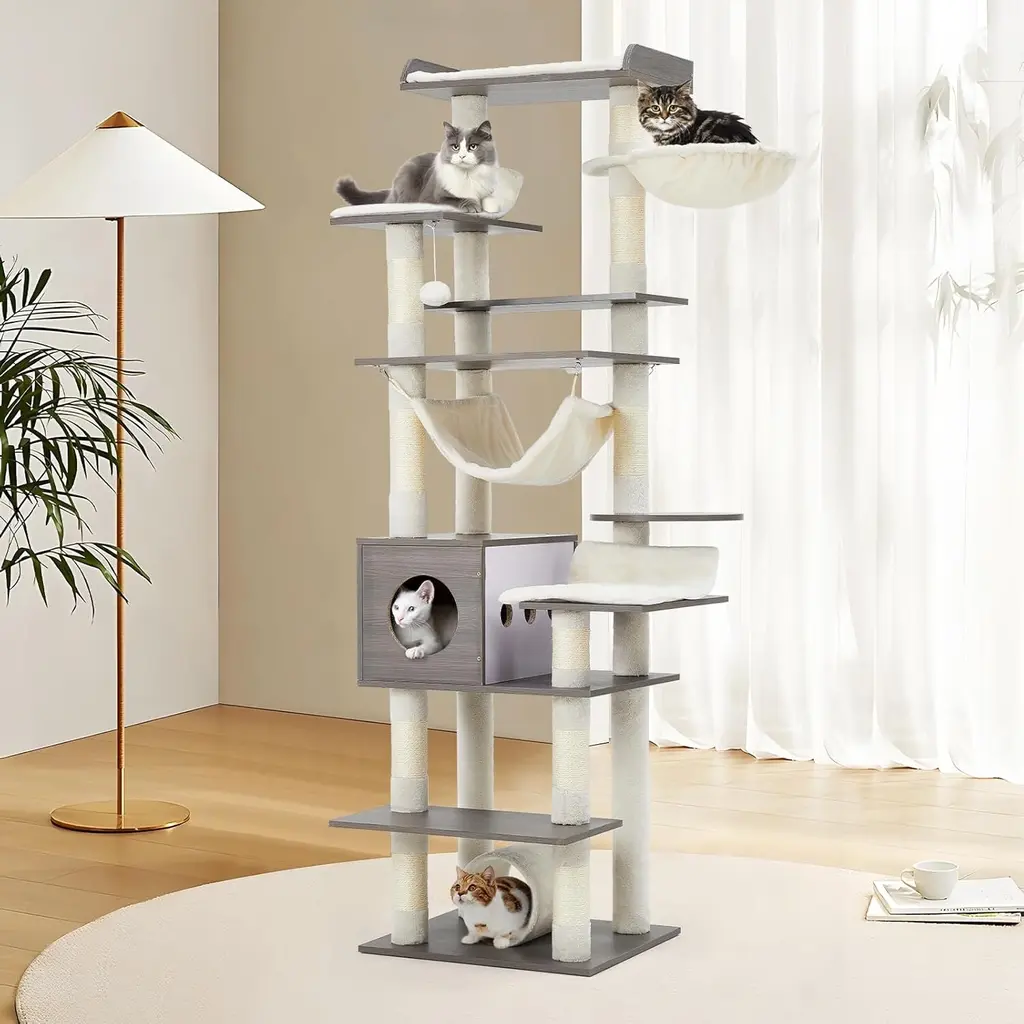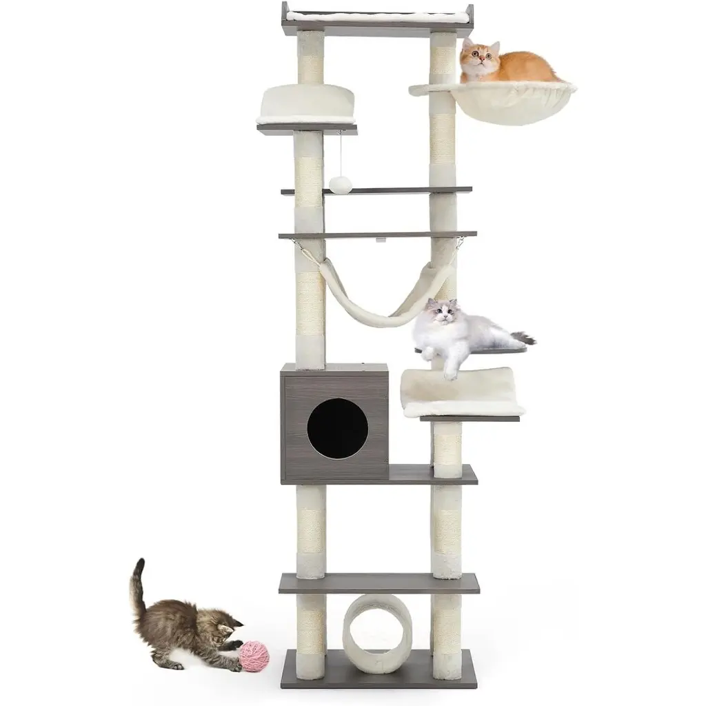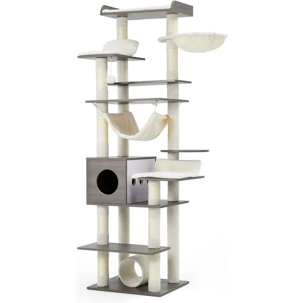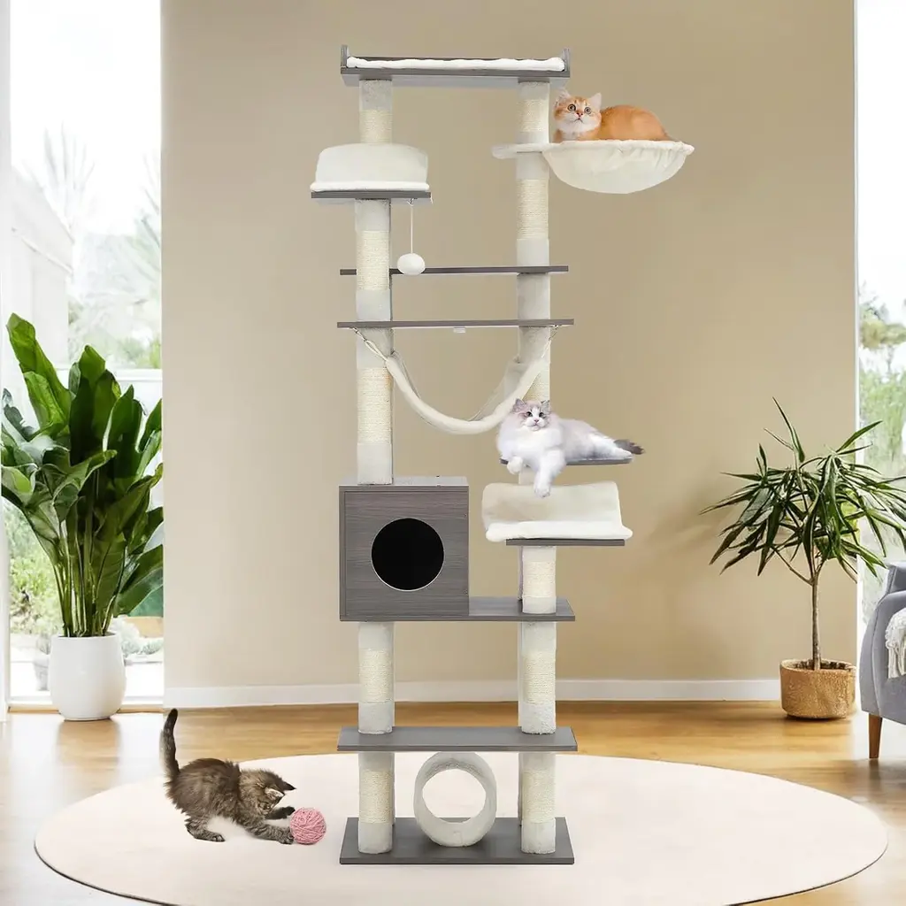 • Multi-Level Design: This cat tower features multiple tiers and easy-to-navigate platforms, making jumping up and down effortless. Anti-tip straps ensure safety, stability, and reliability. • Spacious Cat Tree: Designed with wide platforms, an oversized cat condo, and deep plush baskets, this cat tree is perfect for large cats, adult cats, and multi-cat households! • Comfortable Observation Deck: Understanding cats' love for observing their surroundings, we've included a dedicated lookout perch, providing your feline the perfect vantage point to survey their world. • Easy Assembly: Straightforward instructions make setup a breeze, and with the included anti-tip kit, you'll have this cat tower ready in no time. • Feline Paradise: This cat tower isn't just a resting spot—it's a complete playground. Featuring a cozy hammock, dangling plush ball, dual food bowls, and a catwalk, it creates the perfect space for dining, drinking, and playtime.