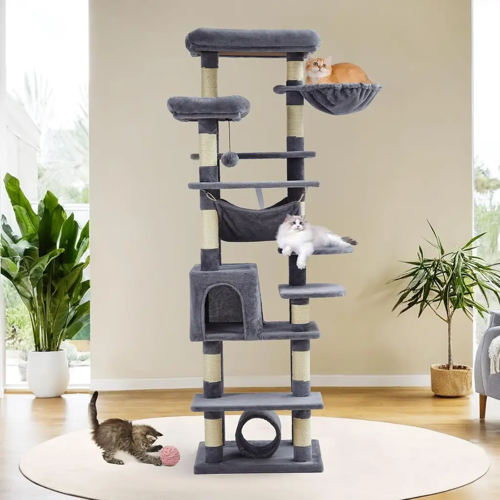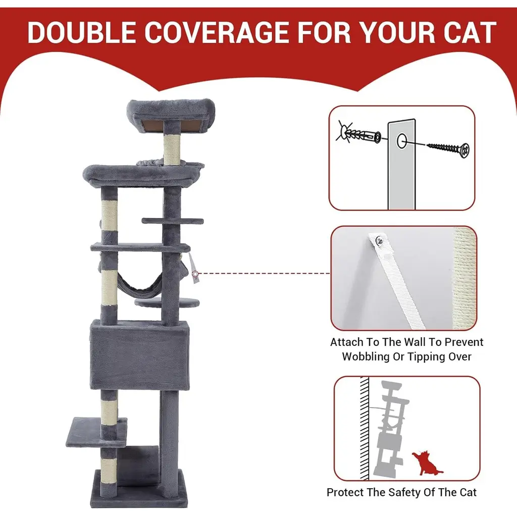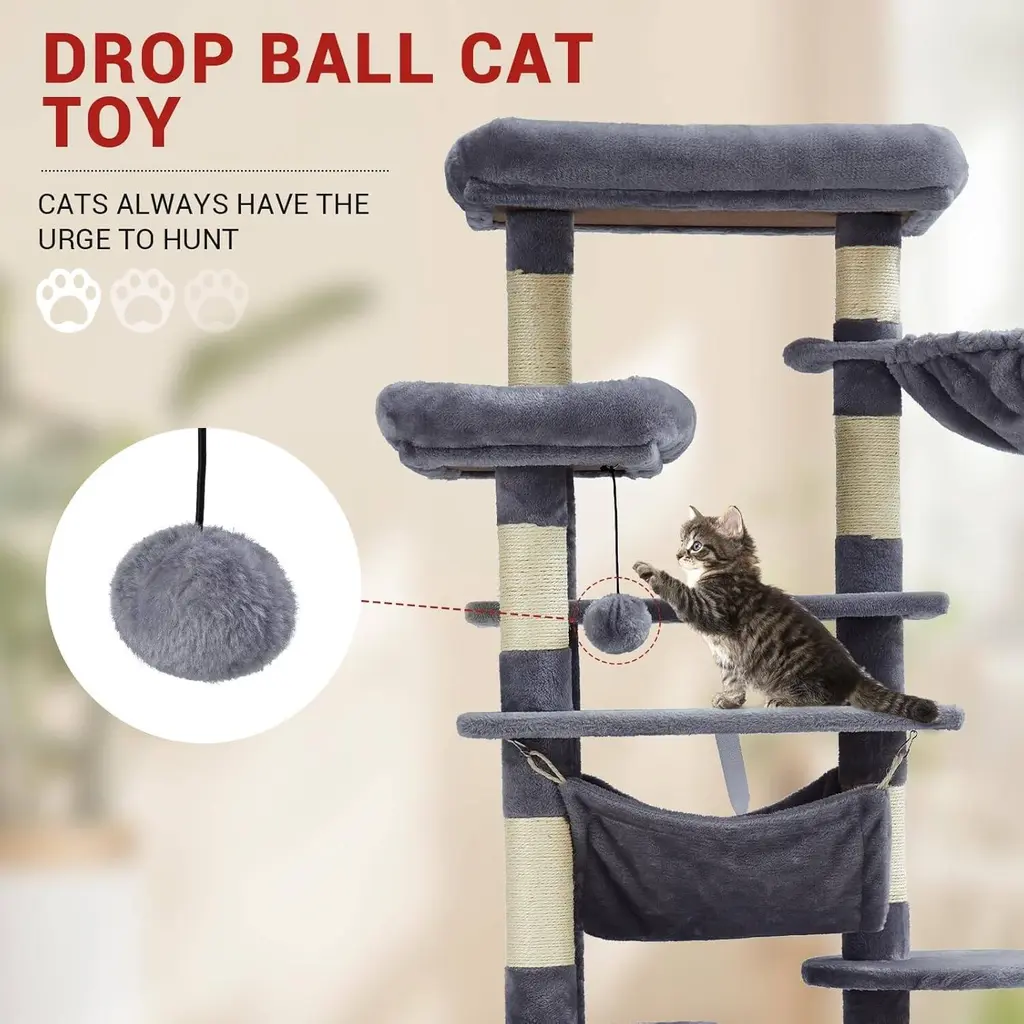 • Multi-Level Design: This cat tower features multiple tiers and easy-to-navigate platforms, making jumping up and down effortless. Anti-tip straps ensure safety, stability, and reliability. • Spacious Cat Tree: Designed with wide platforms, an oversized cat condo, and deep plush baskets, this cat tree is perfect for large cats, adult cats, and multi-cat households! • Comfortable Observation Deck: Understanding cats' love for observing their surroundings, we've included a dedicated lookout perch, providing your feline the perfect vantage point to survey their world. • Easy Assembly: Straightforward instructions make setup a breeze, and with the included anti-tip kit, you'll have this cat tower ready in no time. • Feline Paradise: This cat tower isn't just a resting spot—it's a complete playground. Featuring a cozy hammock, dangling plush ball, dual food bowls, and a catwalk, it creates the perfect space for dining, drinking, and playtime.
