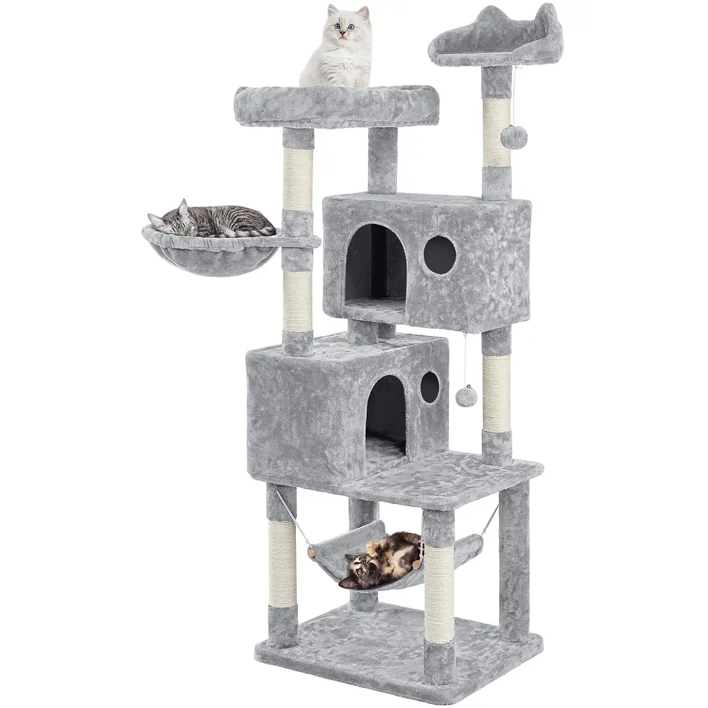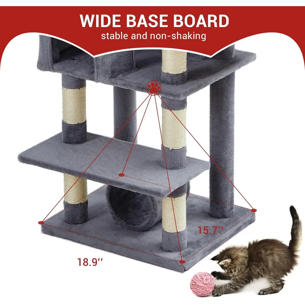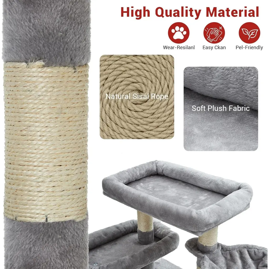 • Multi-Level Design: This cat tower features multiple tiers and easy-to-navigate platforms, making jumping up and down effortless. Anti-tip straps ensure safety, stability, and reliability. • Spacious Cat Tree: Designed with wide platforms, an oversized cat condo, and deep plush baskets, this cat tree is perfect for large cats, adult cats, and multi-cat households! • Comfortable Observation Deck: Understanding cats' love for observing their surroundings, we've included a dedicated lookout perch, providing your feline the perfect vantage point to survey their world. • Easy Assembly: Straightforward instructions make setup a breeze, and with the included anti-tip kit, you'll have this cat tower ready in no time. • Feline Paradise: This cat tower isn't just a resting spot—it's a complete playground. Featuring a cozy hammock, dangling plush ball, dual food bowls, and a catwalk, it creates the perfect space for dining, drinking, and playtime.