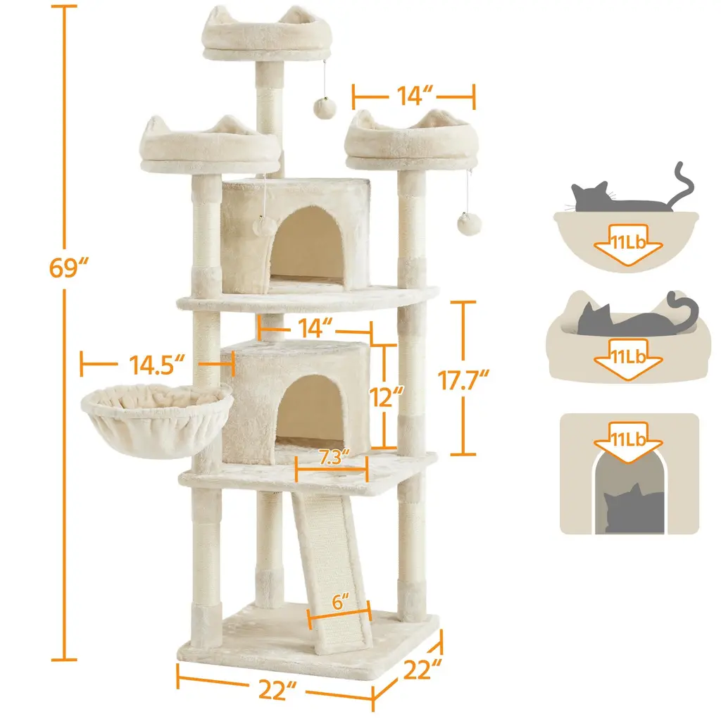 MULTI-LEVEL: This large cat tree features multiple levels with 3 perches, 2 condos, 1 basket, 8 scratching posts, 1 scratching board, and 3 hanging balls. Multiple levels and layouts make this cat tree interesting and practical, enough for sleeping and playing FUNNY COMFY PERCHES: The three perches at the top of the cat tree are designed to be cute and funny in the shape of cat ears. These three small platforms are soft whose padding around edges is PP foam, and to ensure comfort while increasing interest in the cat tree, the edges of the boards have plush hanging balls, which can be removed or replaced with your cats' favorite toys PLUSH CAT TOWER: The whole cat tower is covered by soft plush with durable sisal ropes of the scratching posts and board. This is a comfy, interesting, harmless, and practical cat tower. Selected materials of the cat tower will ensure you and your cats a long service life FOR MORE THAN ONE CAT HOME: This professional cat tree has three perched platforms, two fan-shaped condos, one plush basket, one scratching board, eight scratching posts, and three elastic balls. This large cat tree is suitable for two or three normal-sized cats or several kittens DOUBLE STABILITY: To enhance the stability of the cat tree, we use anti-toppling screws, so that you can secure the cat tree to the wall for extra protection. For stability, place the cat tree on a flat floor and in a corner or against the wall, avoid placing it in a humid environment