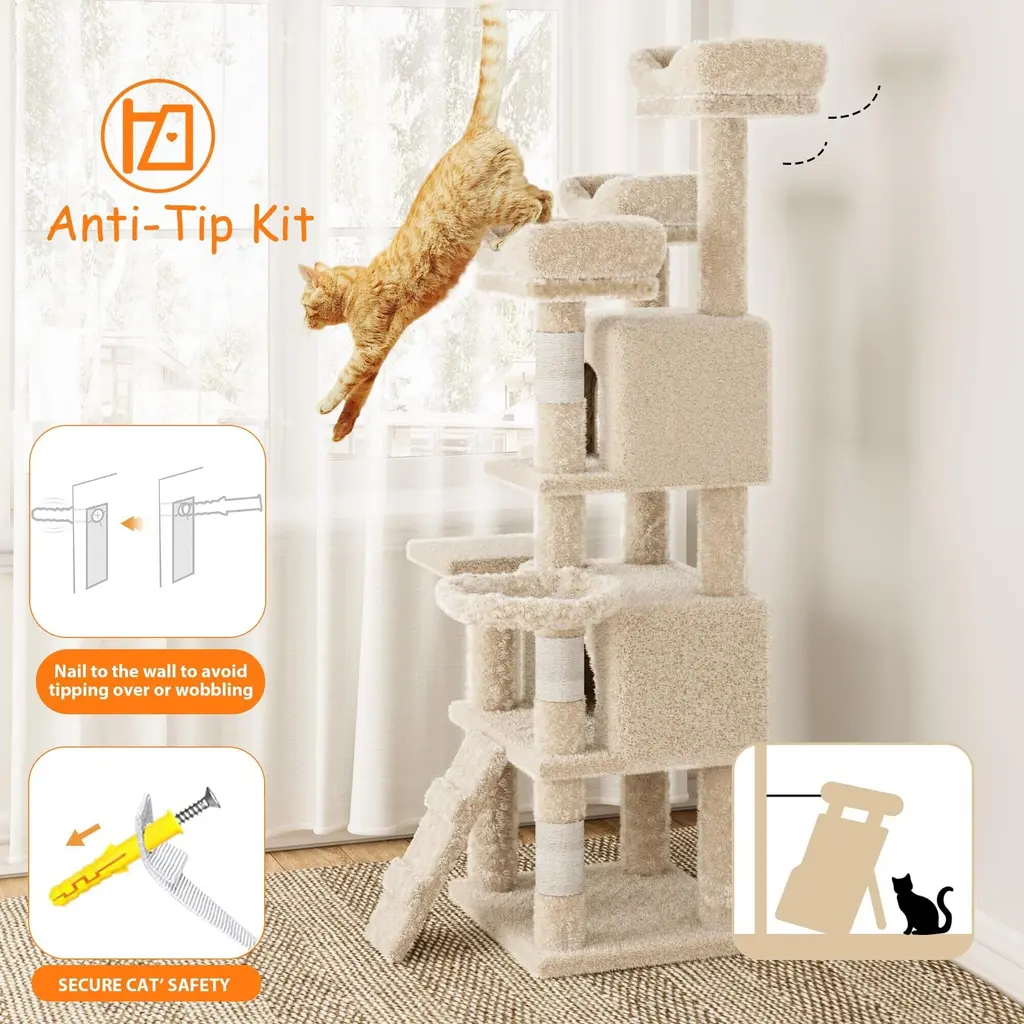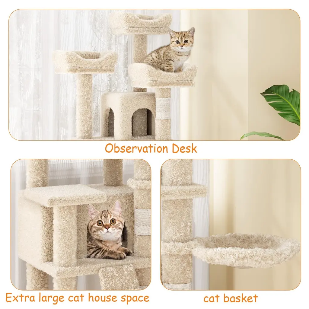 Multi-Layer Design: This cat tree features a multi-layer structure that provides convenient spaces for scratching, napping, playing, and lounging. The thoughtfully tested design ensures that each platform is easily accessible for cats of all ages and sizes, promoting healthy activity and comfort. Quiet and Comfortable: Covered in skin-friendly plush faux fur, the cat tree offers super soft and warm lounging spots, creating an ideal environment for your cats to curl up and take a restful nap, ensuring they feel cozy and secure while they relax. Scratching Posts: Equipped with two scratching posts, this cat tree encourages healthy scratching behavior, helping your cat stretch, exercise their muscles, and develop balance and agility. This feature also protects your furniture from scratches, appealing to both cats and their owners. Sturdy and Stable: Designed with a wide base and an anti-tip kit for added safety, this cat tower offers strong support, allowing your active feline to jump in and out without the risk of tipping over. This stability ensures a safe play environment for your cat. Easy to Assemble: The cat tree comes with detailed graphic instructions for straightforward assembly, making it easy to set up in just a few minutes. With clear instructions and minimal effort required, you can confidently assemble your new cat condo without any hassle.