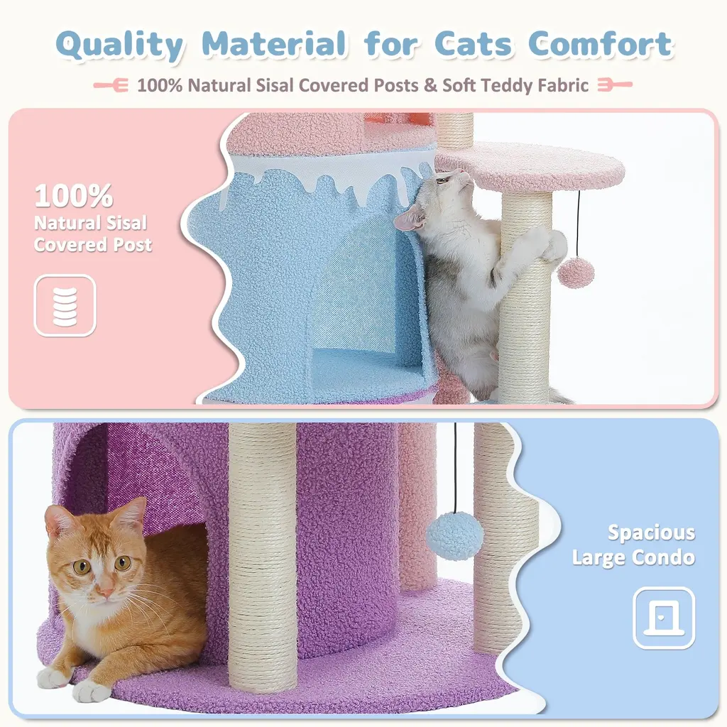 Introducing our 43-inch Cake-Shaped Cat Tree Tower, designed to satisfy the needs of your large indoor cats. This unique cat tree features a visually appealing 5-tier spiral platform that not only adds style to your home but also provides a fun and engaging environment for your furry friends. Spacious Design: This 43-inch cat tree tower is specifically designed for large indoor cats, providing them with ample space to play, climb, and rest comfortably. Multiple Condos: The cat tree features three large condos, each with a diameter of 13.6 inches, providing private spaces for your cats to relax and sleep. Sturdy Base: The extra-large base, with a diameter of 21.5 inches, ensures stability and prevents tipping even during vigorous play. Secure Top Perch: The top of the cat tree is equipped with a fenced circular platform, measuring 16 inches in diameter, offering a secure and cozy spot for your cats to observe their surroundings. Durable Construction: Made from high-quality materials including wood, cardboard tubes, plush fabric, and sisal, ensuring long-lasting durability and providing your cats with a variety of textures to scratch and play with.