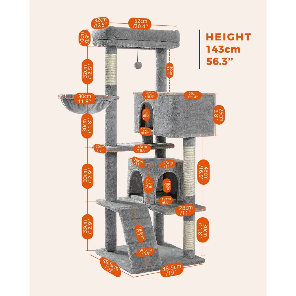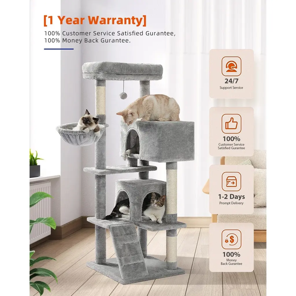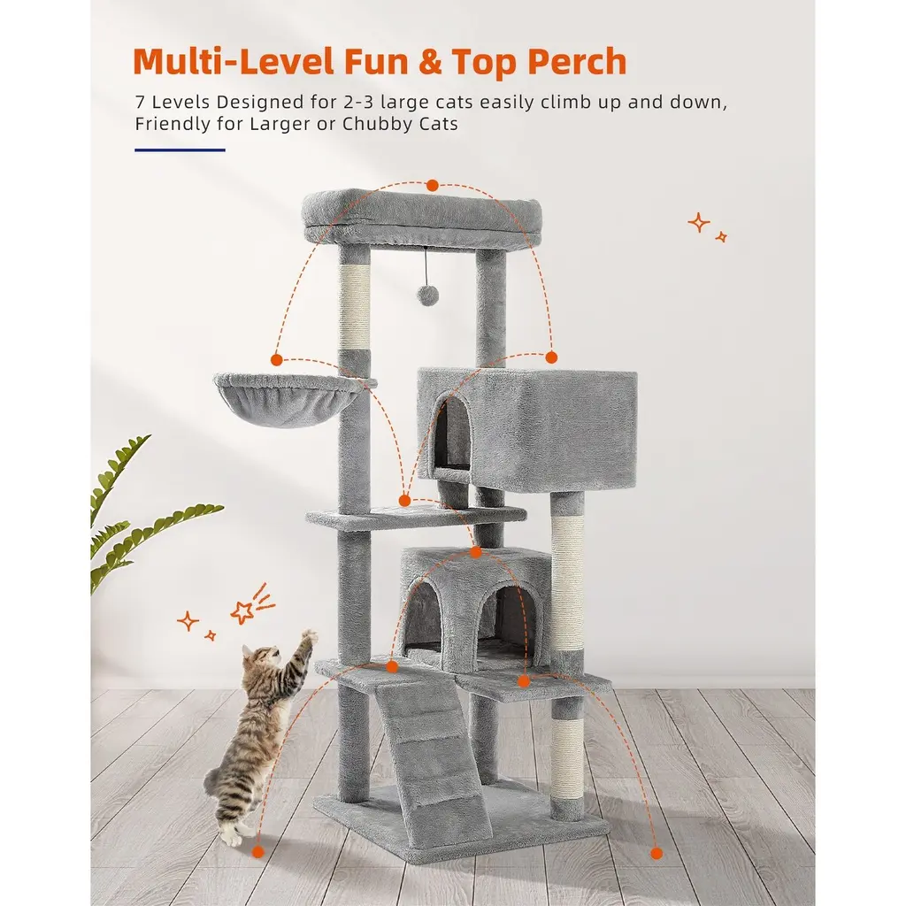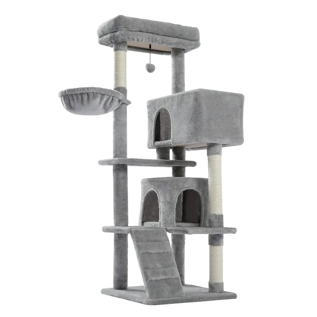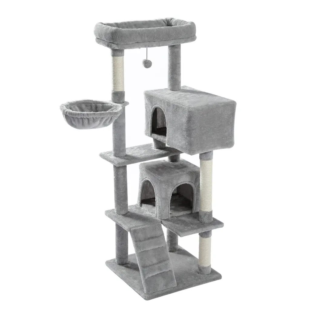 Cat Tree With Large Top Perch, Plush Hammock, 2 Condos, Dangling Pompom & Cat Scratching Posts - Grey