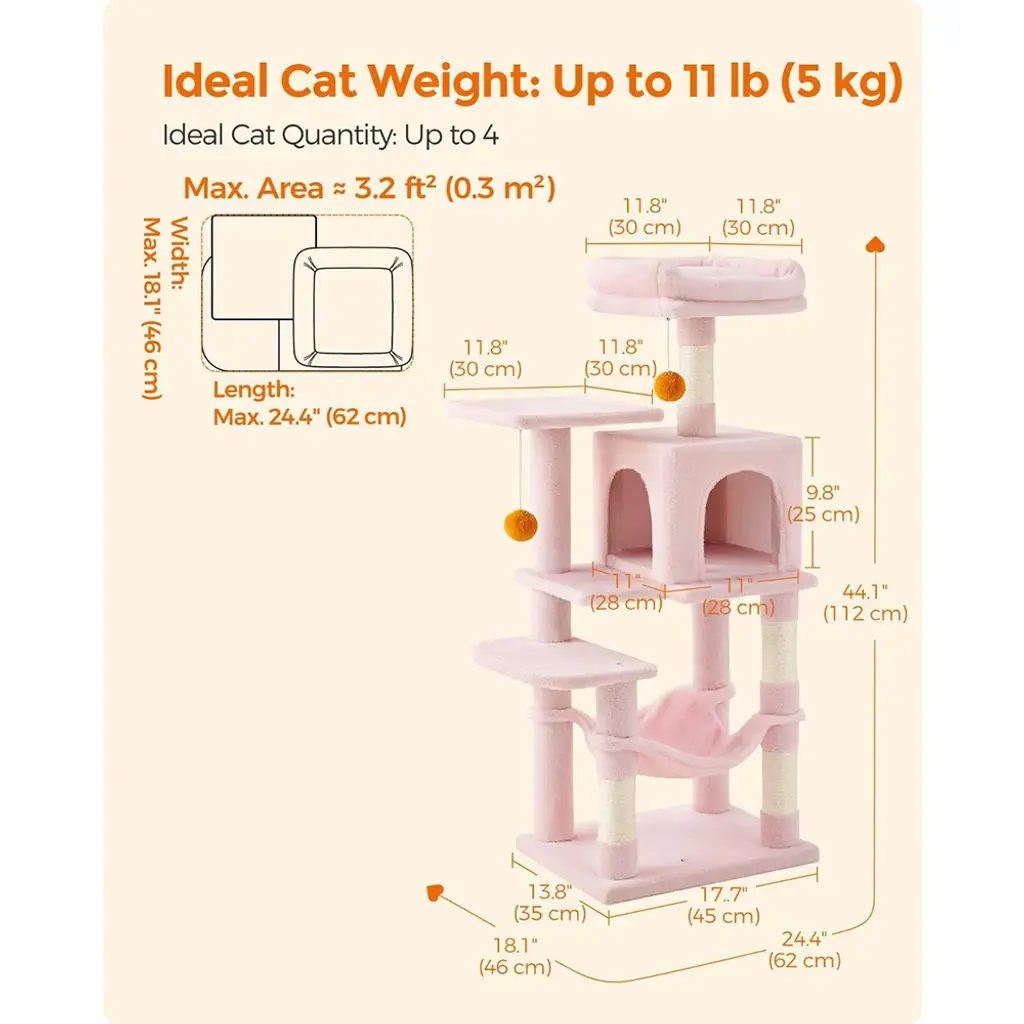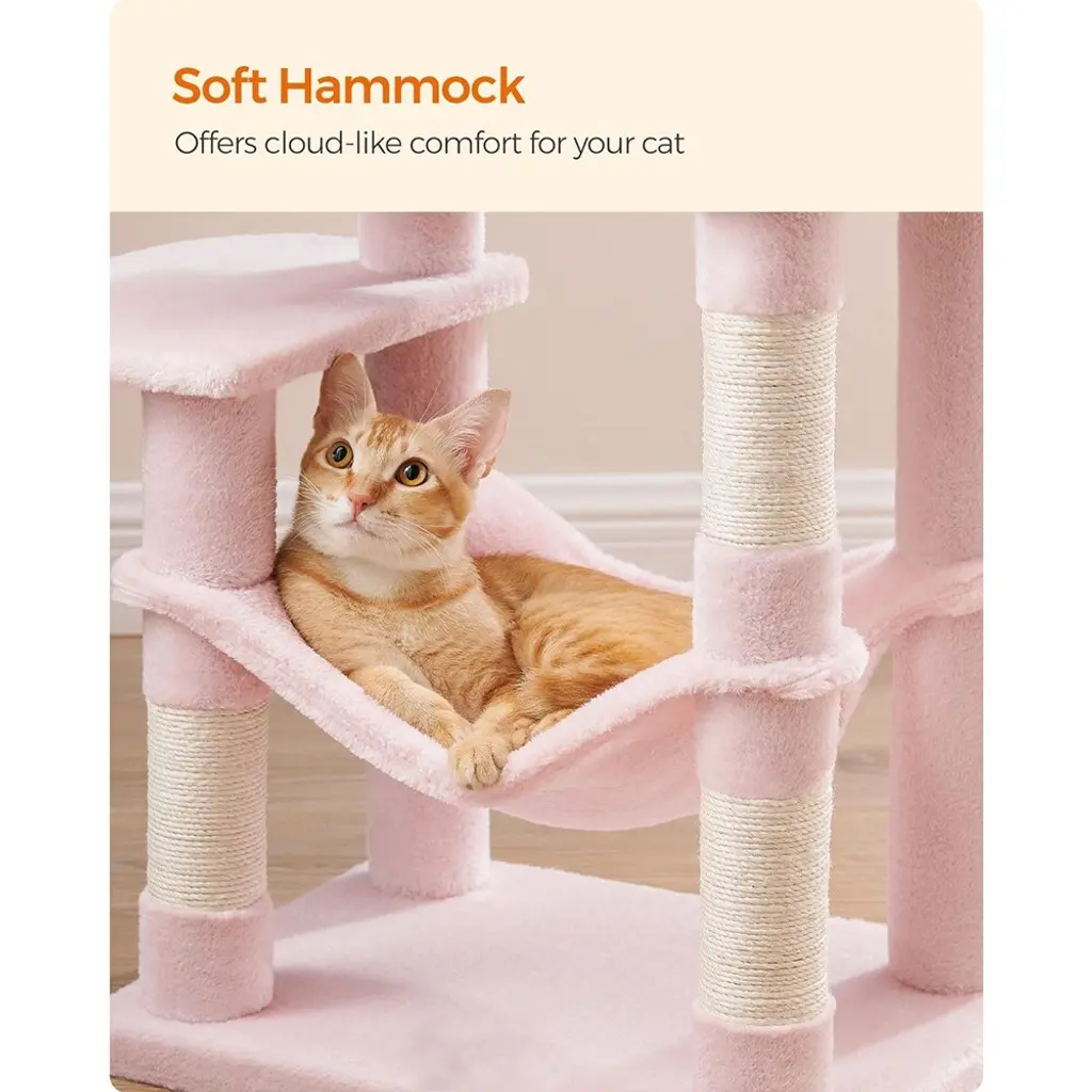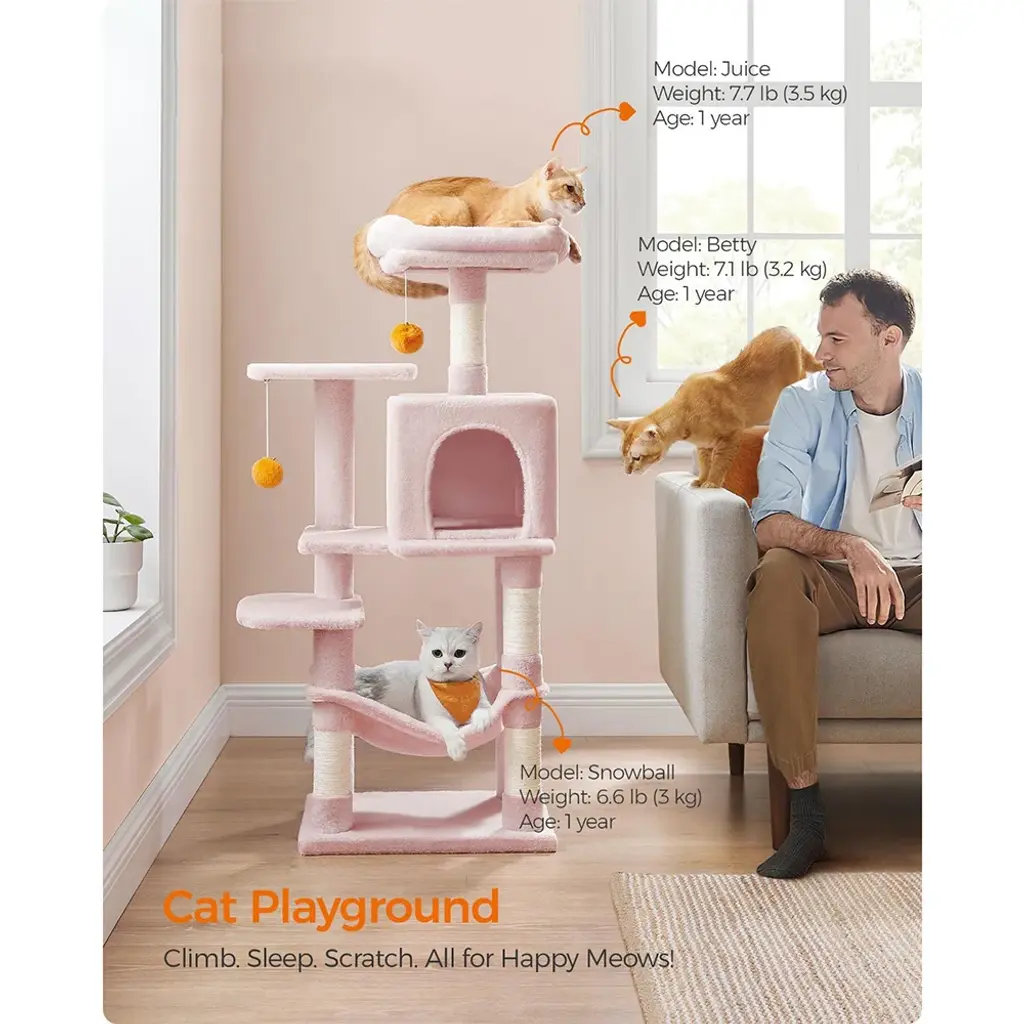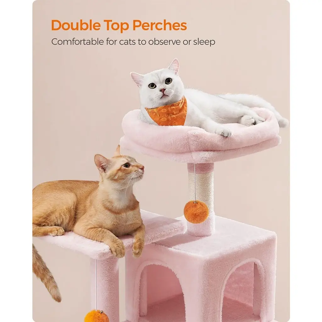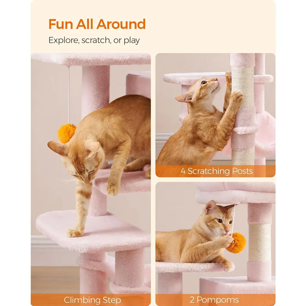 Cat Tree With Scratching Posts And 2 Hanging Pompoms With Bells Perfect For Indoor Pets - Medium - Jelly-Pink