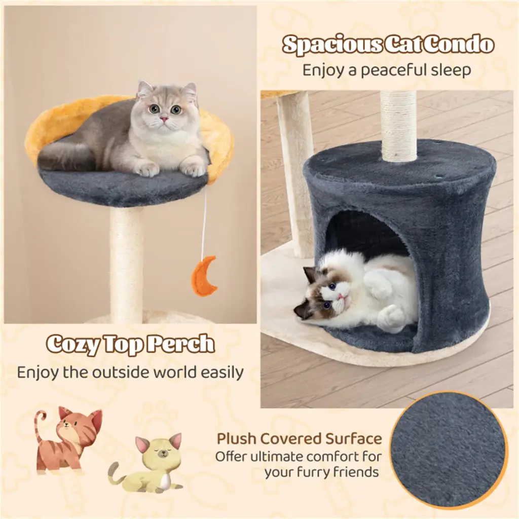 Specification: Key Features: Description: This 50" tall cat tree provides the perfect retreat for your feline friends, featuring a spacious condo and elevated perch for lounging and panoramic views. With interactive hanging toys and multiple platforms, it encourages physical activity and exercise, promoting healthy claws with its star-shaped sisal board and wrapped scratching posts. Designed for safety and stability, the cat tower includes a wide base and anti-tipping device to prevent wobbling. Upholstered in soft plush material, it seamlessly blends neutral gray and beige tones to complement any home decor, while offering comfort and fun for your cats.