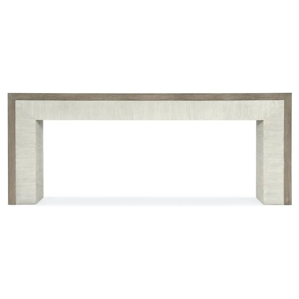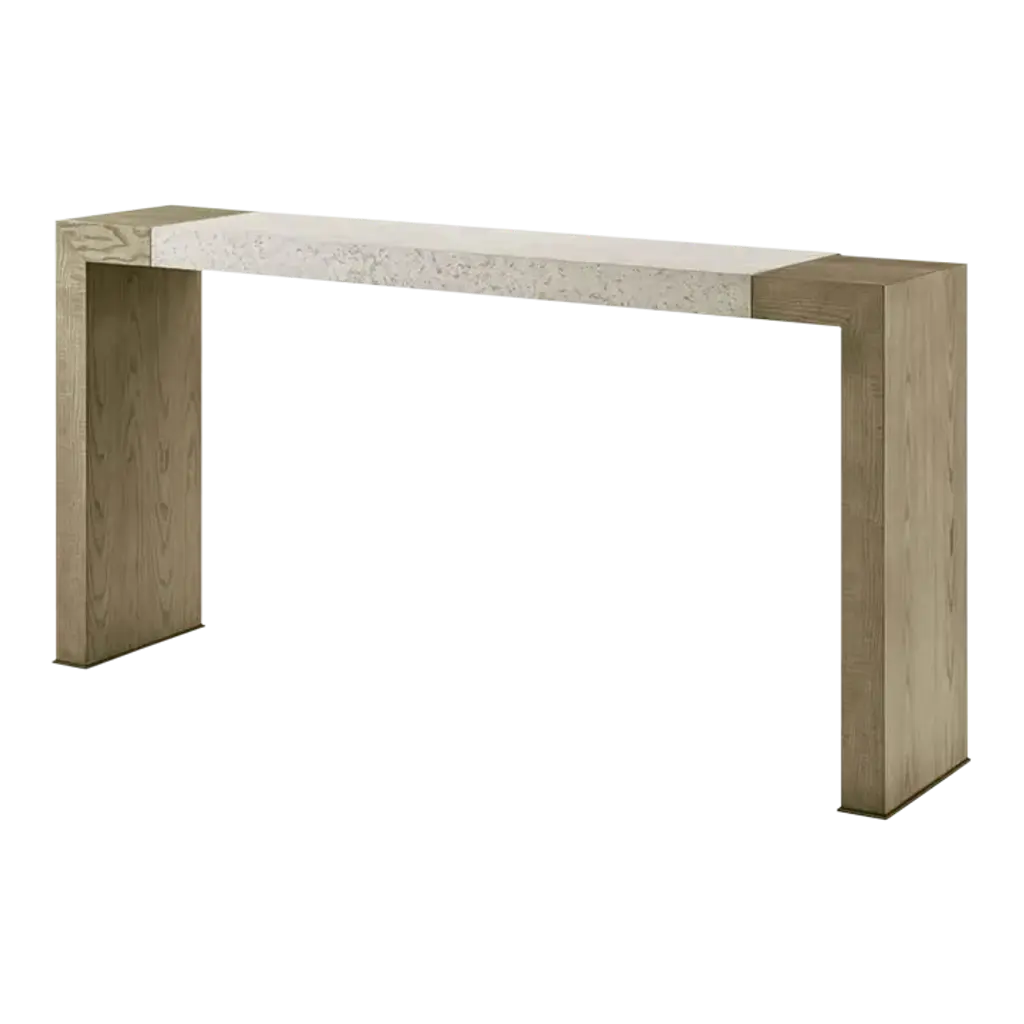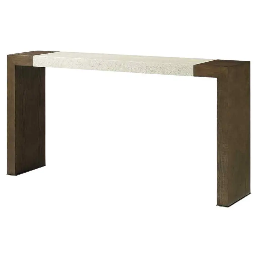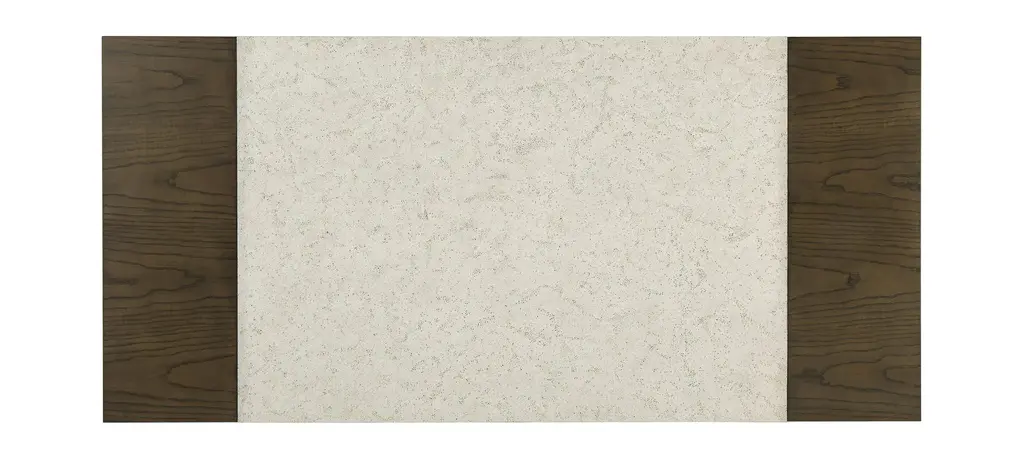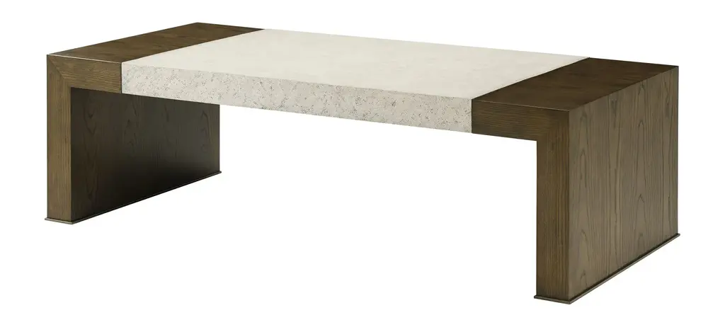 The Catalina cocktail table II is a modern parsons style cocktail table made with a mineral finish at the top and metal detail at the base of the legs in a bronze finish.