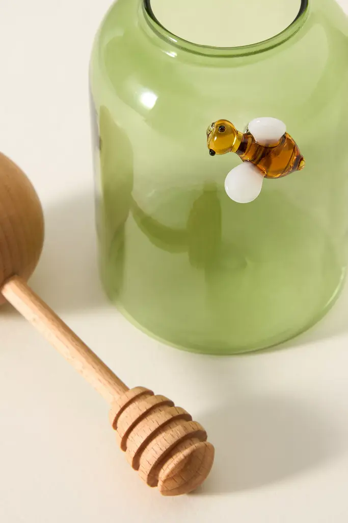 As sweet as honey: this sculptural honey pot, featuring a translucent pop of color, warm wood, and, of course, a figural bee. Please note: The composition of borosilicate glass allows for beautiful transparency and thermal stability but can make it more susceptible to cracking and breaking. Please handle this style with care!