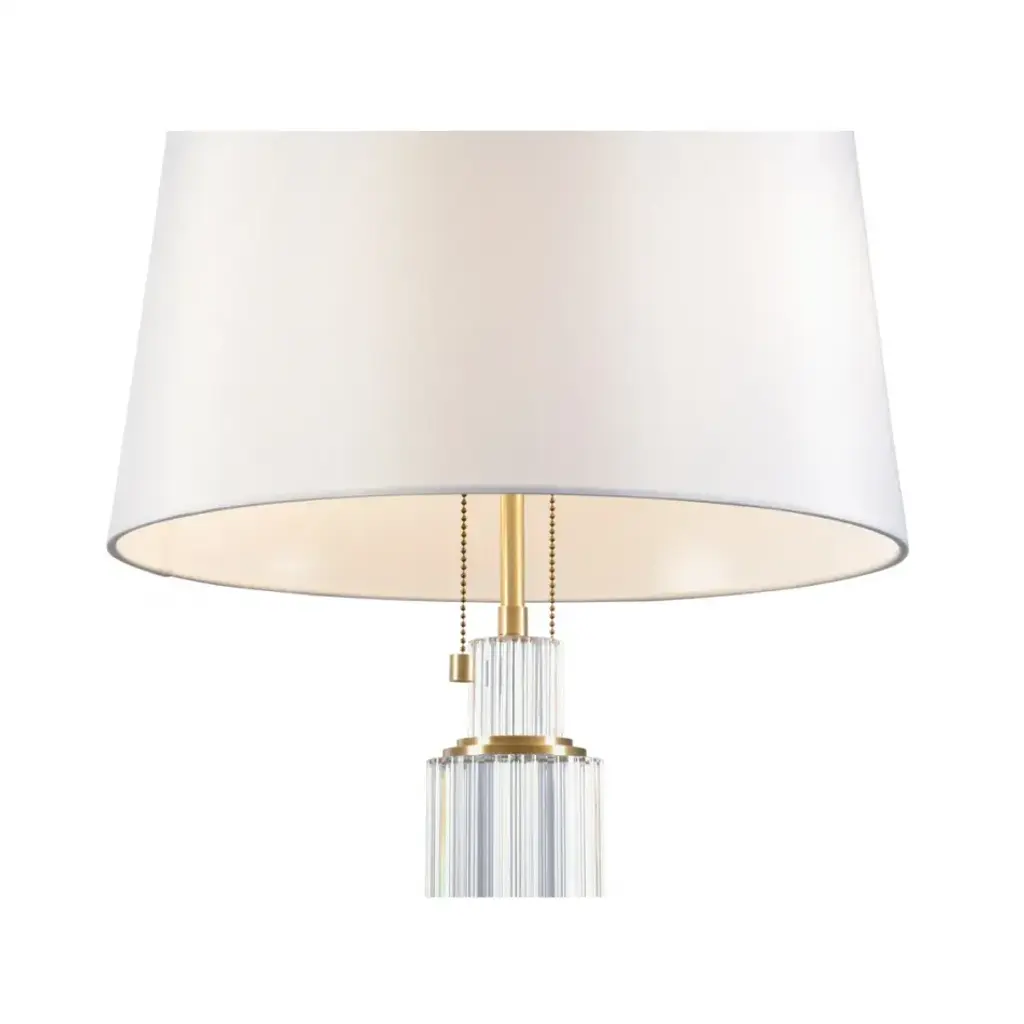 Ideal for formal entryway, living area or dining rooms, Catania Lamp is both elegant and functional. A series of clear crystal rods surround the column and are highlighted with antique brass details. The off-white linen shade and cylindrical finial add the finishing touch to the sophisticated design.