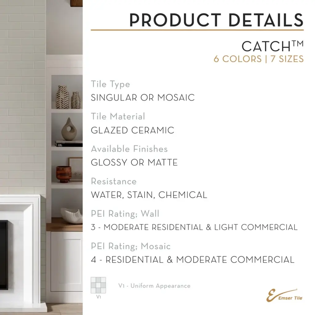 Catch™, a glazed ceramic wall tile that will capture your imagination and inspire truly one-of-a-kind designs. This is no ordinary subway tile. The cool color tones are reminiscent of ocean waves and bring a sense of serenity to any room.